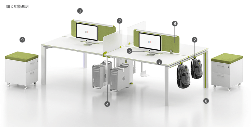| 5、台下过强弱电过线系统。 | 6、桌面吸音隔板,多选人性化颜色可选。 |