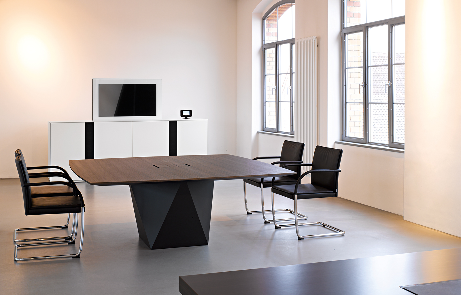 召开会议,是集中和沟通解决问题的方法。Scale-Media系列解决了会议场所问题。无论是大型会议还是小型会议,不同的会议桌规格可以很好的解决所有问题。从矩形到船形,再到椭圆形和梯形桌面,都可以选择镶面或者漆面,这也是scale - media系列定制会议桌的关键.