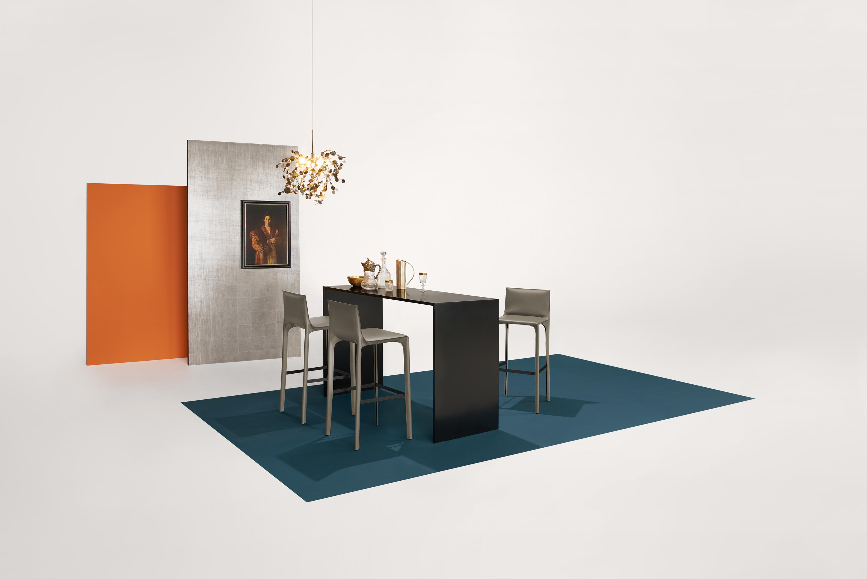 吧椅和标准椅都是鞍椅系列的延伸。它们遵循优雅的刚毅形状设计理念,将皮革片进行切割,边缘抛光和染色,再通过精密的缝合绘制。