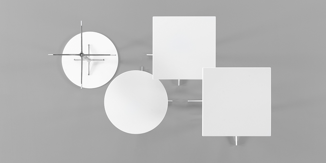 有四种高度(36.4,50,74和105厘米)可供选择,圆形和方形顶部有各种尺寸。 四星级底座采用闪亮或白色涂层铝制成。