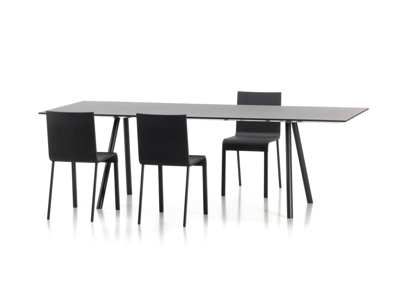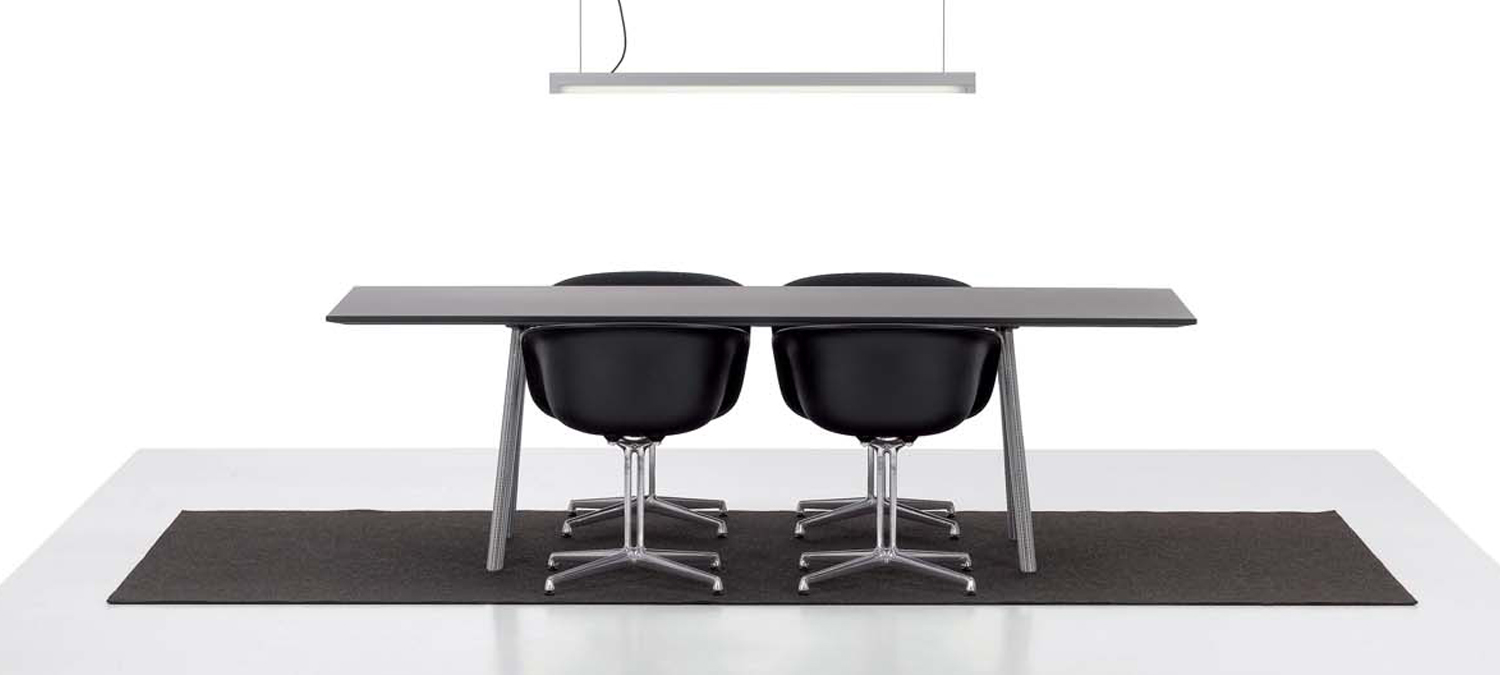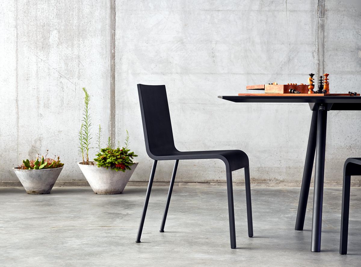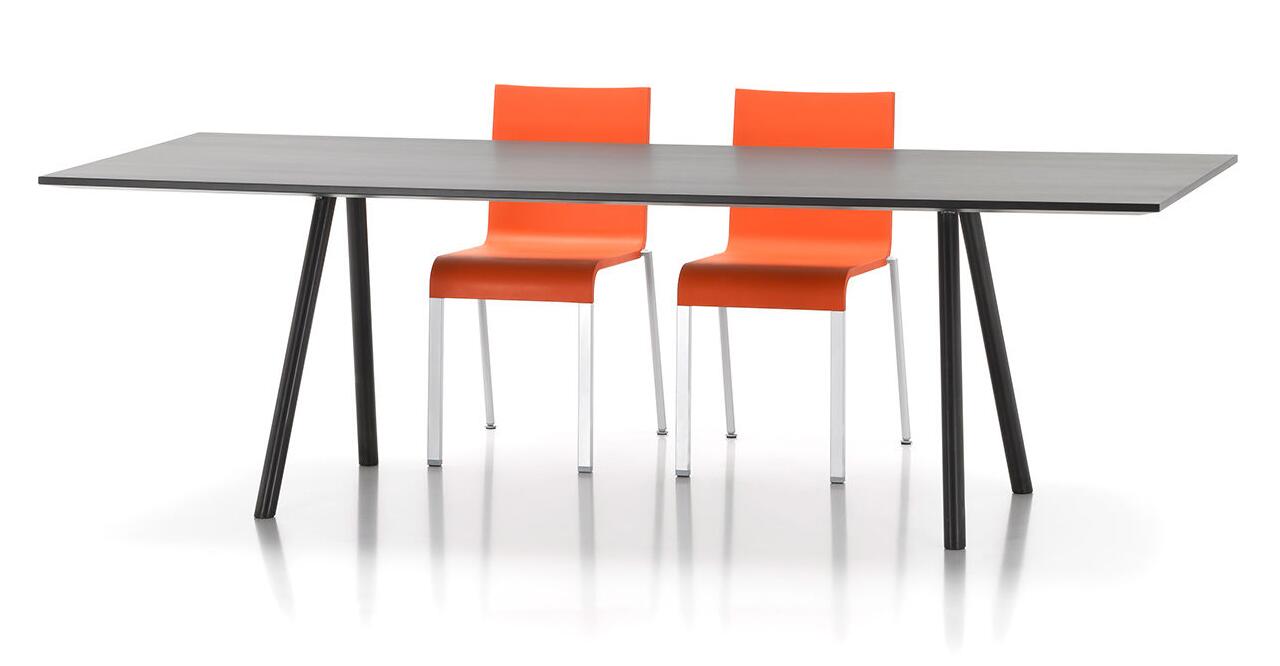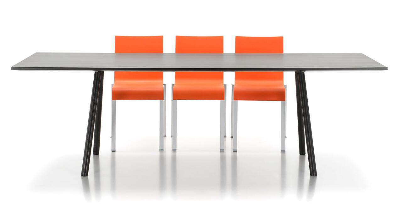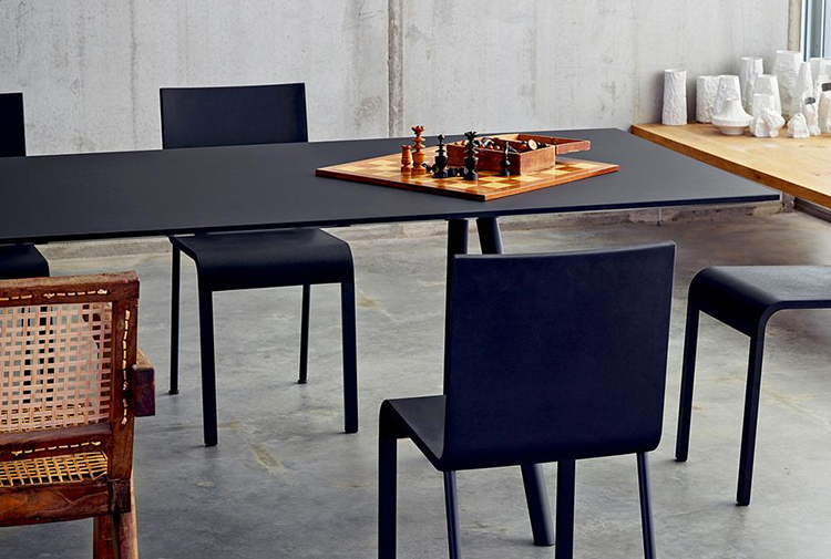 像A-Table这样的纯粹设计使Maarten Van Severen成名:具有象征美感和精心平衡比例的产品成为他的标志。 桌面采用油毡表面,这是一种天然且耐磨的材料,营造出整体效果。 黑色桌腿突出了这种外观。
