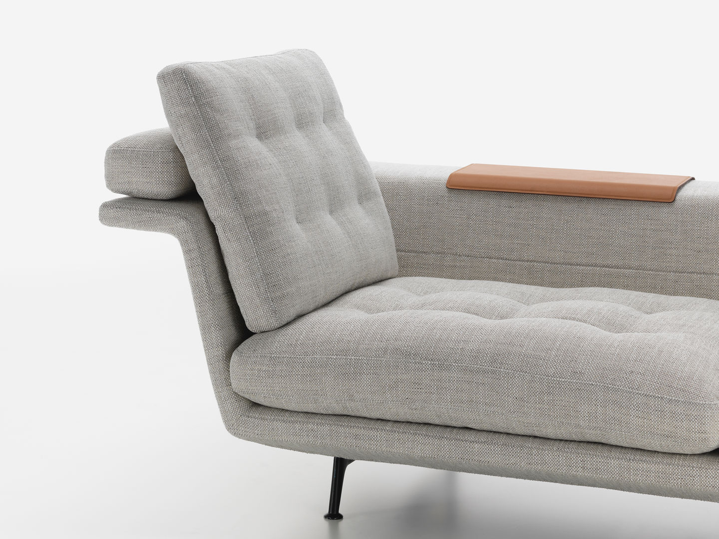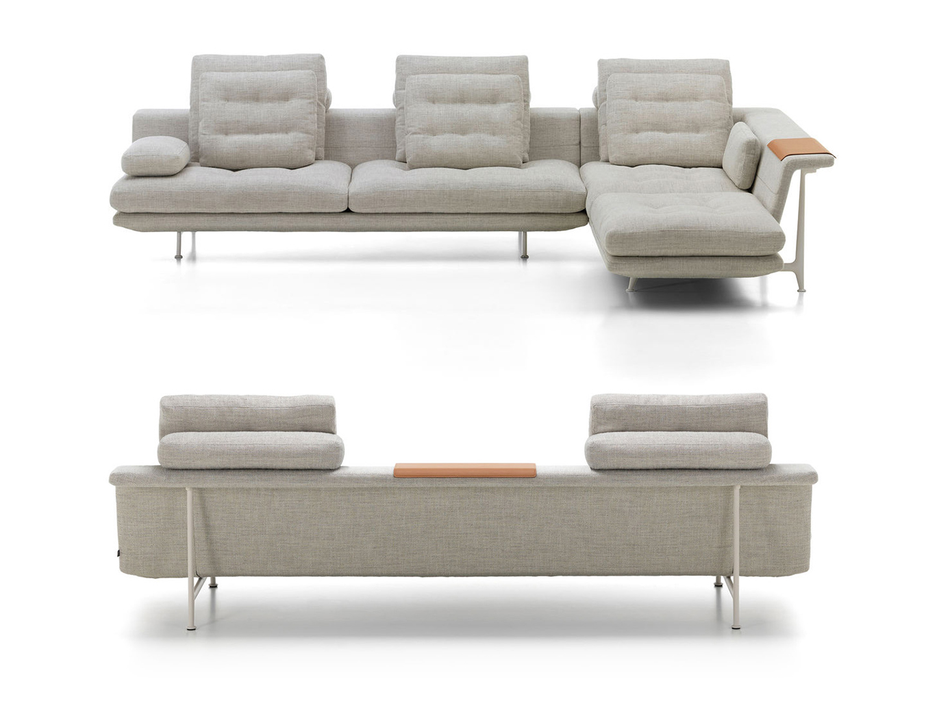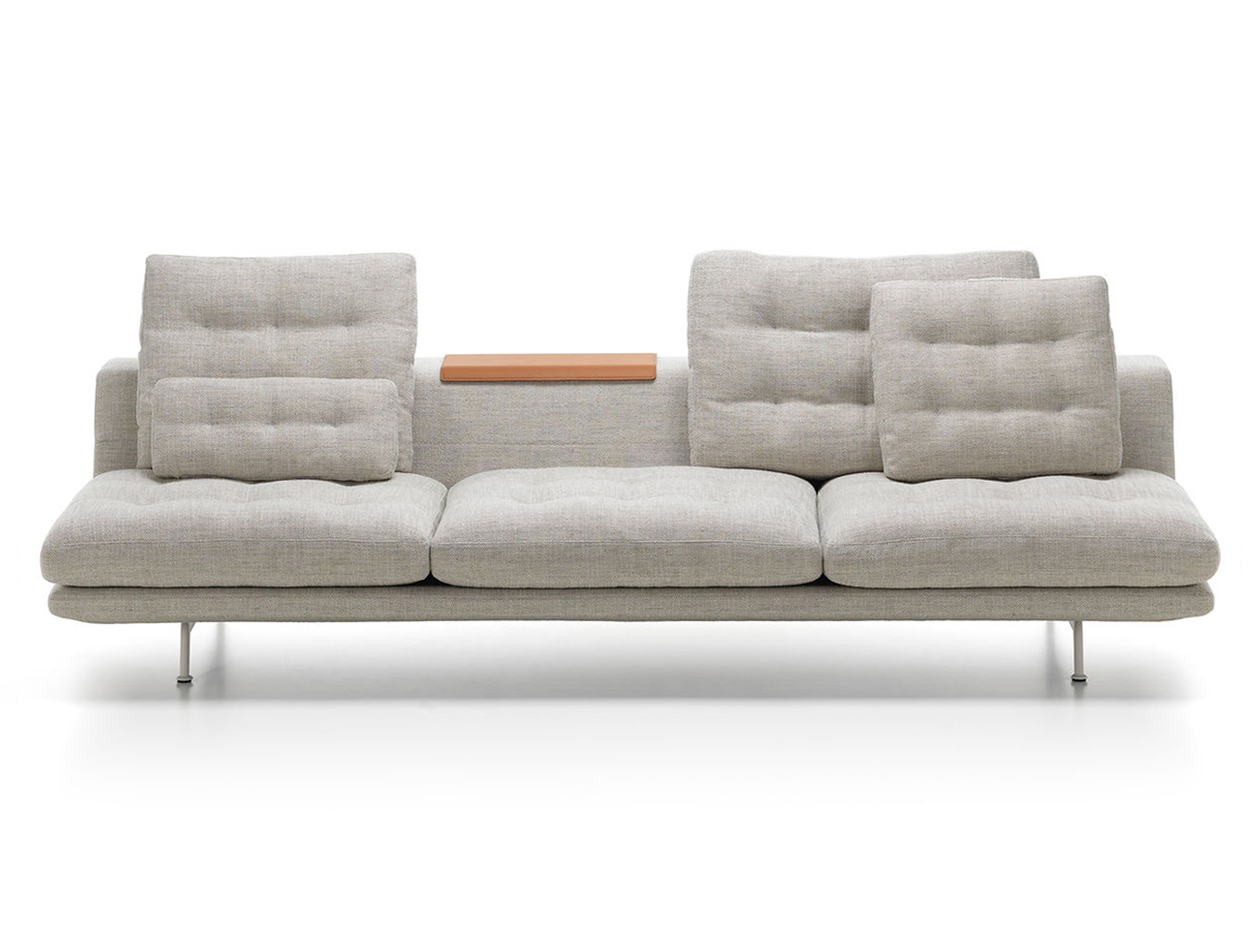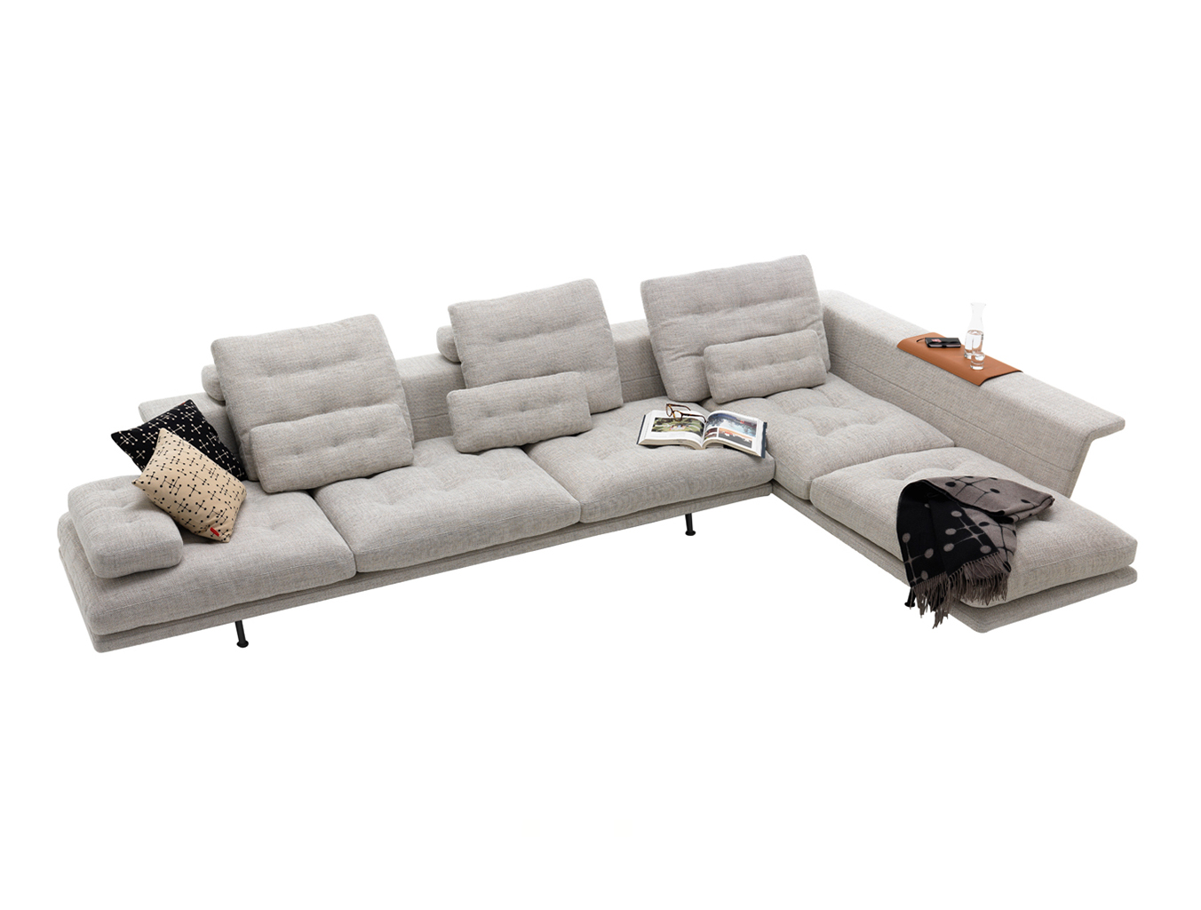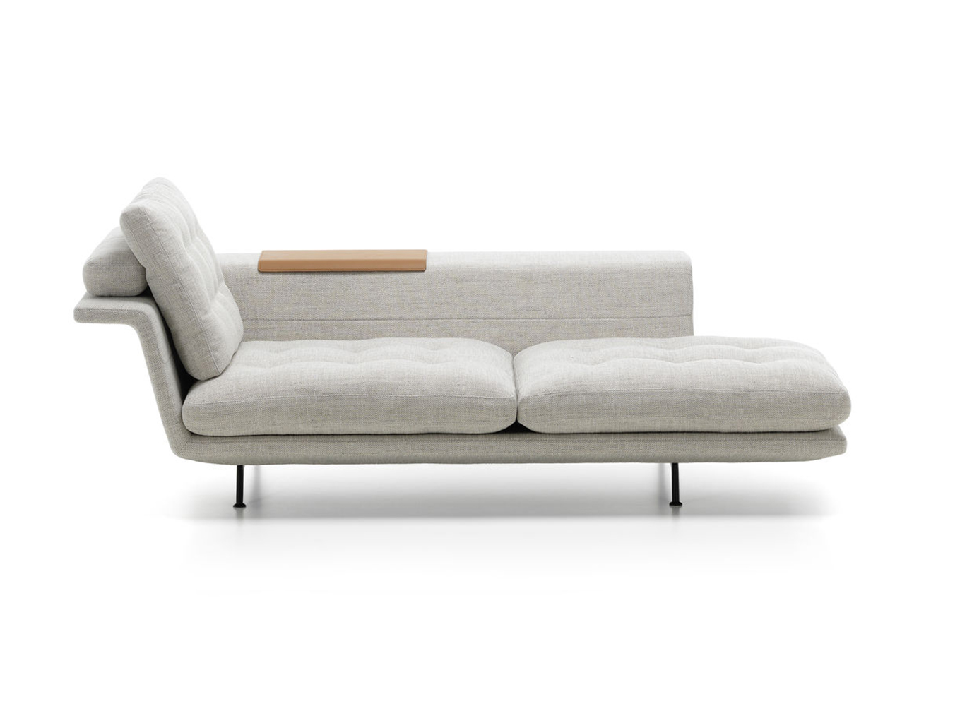 由于Grand Sofa的开放式组合以及所创造的空间选择,可以坐在沙发后面,使用织物覆盖的壁架进行笔记本电脑工作或其他任务。 搁板式壁架也适用于存放书籍,杂志和配件。 为了容纳眼镜,瓶子或花瓶等物品,它可以配备沙发托盘,沙发托盘沿侧面倾斜以适合边缘。 翻转过来,沙发托盘可以作为沙发任何平坦区域的实用表面。
