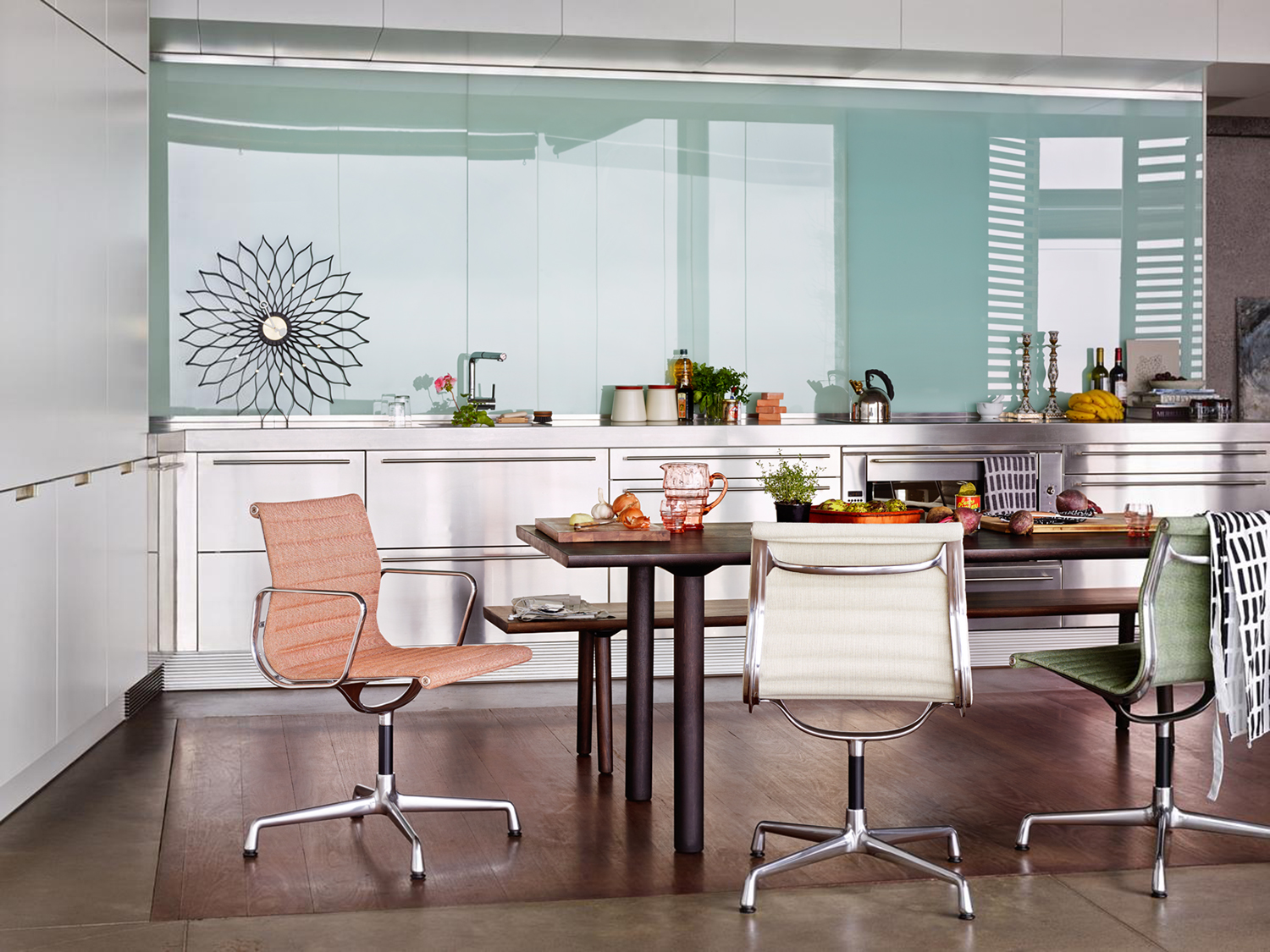 Charles和Ray Eames的铝椅EA 101,EA 103和EA 104非常适合与桌子组合使用:与铝组的其他型号相比,它们更轻,更高,更窄。 由于室内装潢具有多种柔和鲜艳的色彩,因此很容易找到适合任何餐厅的完美椅子。 这三种型号的不同之处在于基座的类型 - 固定或旋转 - 以及是否存在臂。