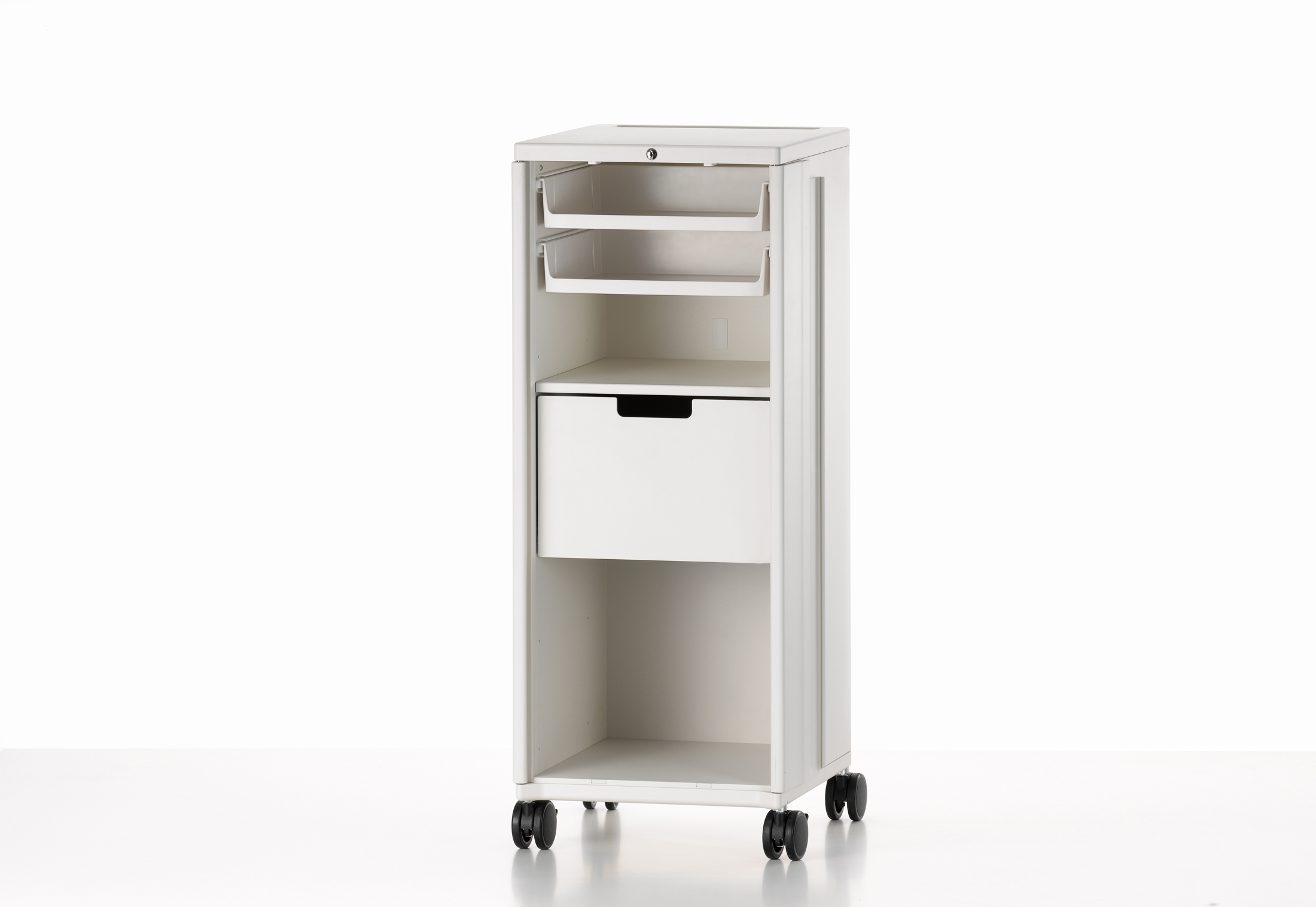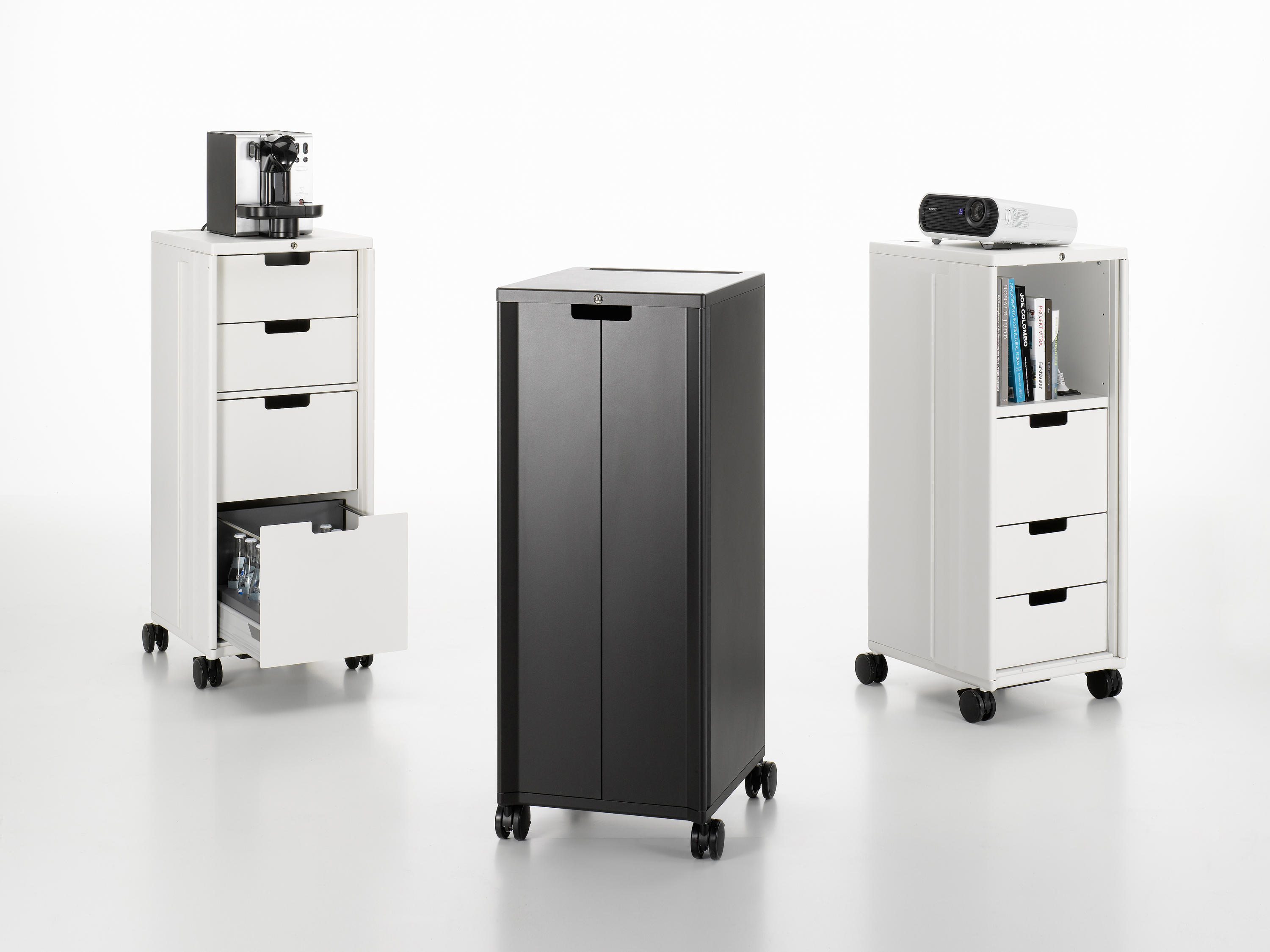 飞机手推车激发了建筑师和设计师Christoph Ingenhoven的灵感,开发出带Vitra的移动存储家具Caddy。 由粉末涂层钢板制成,Caddy坚固耐用,其各种家具选择使其成为办公室的实用伴侣:它还可以配置为复杂的电气化站立工作场所,作为演示投影仪的基础或作为餐饮用途的帮手。