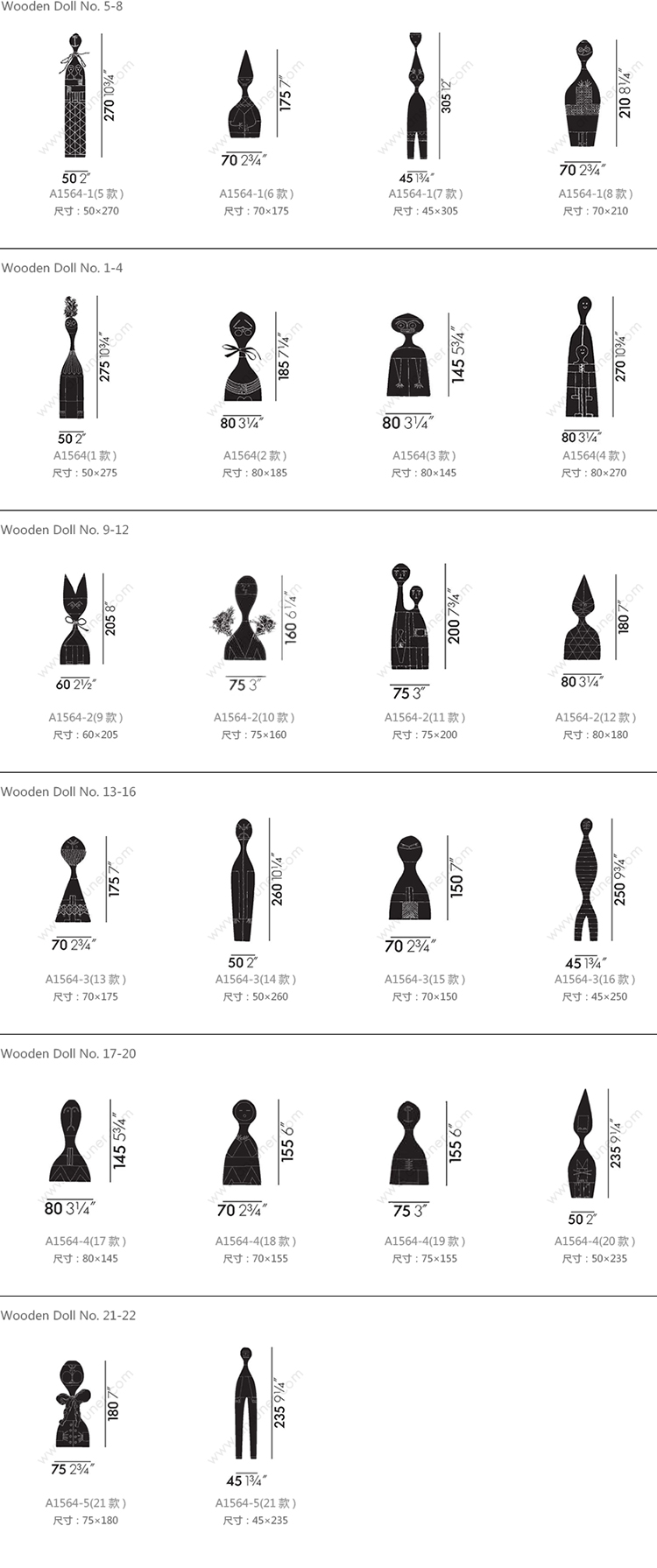 Wooden Doll No.5-8 系列尺寸/示意图