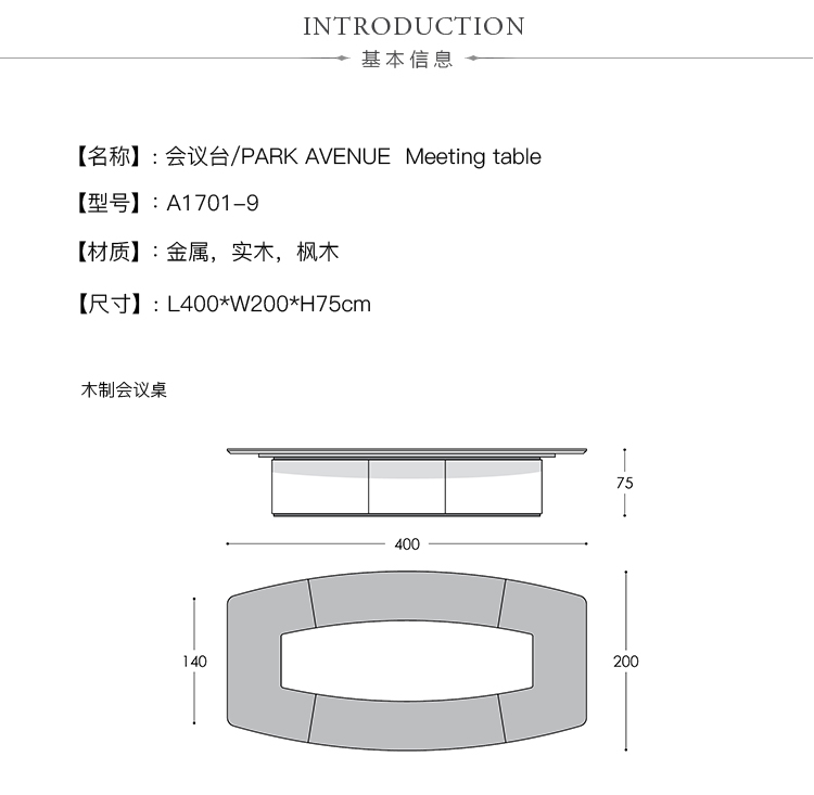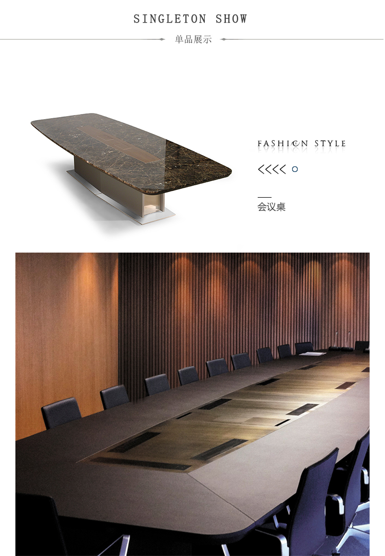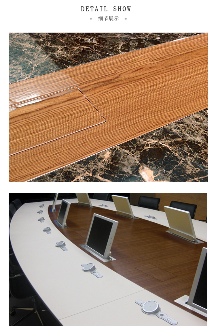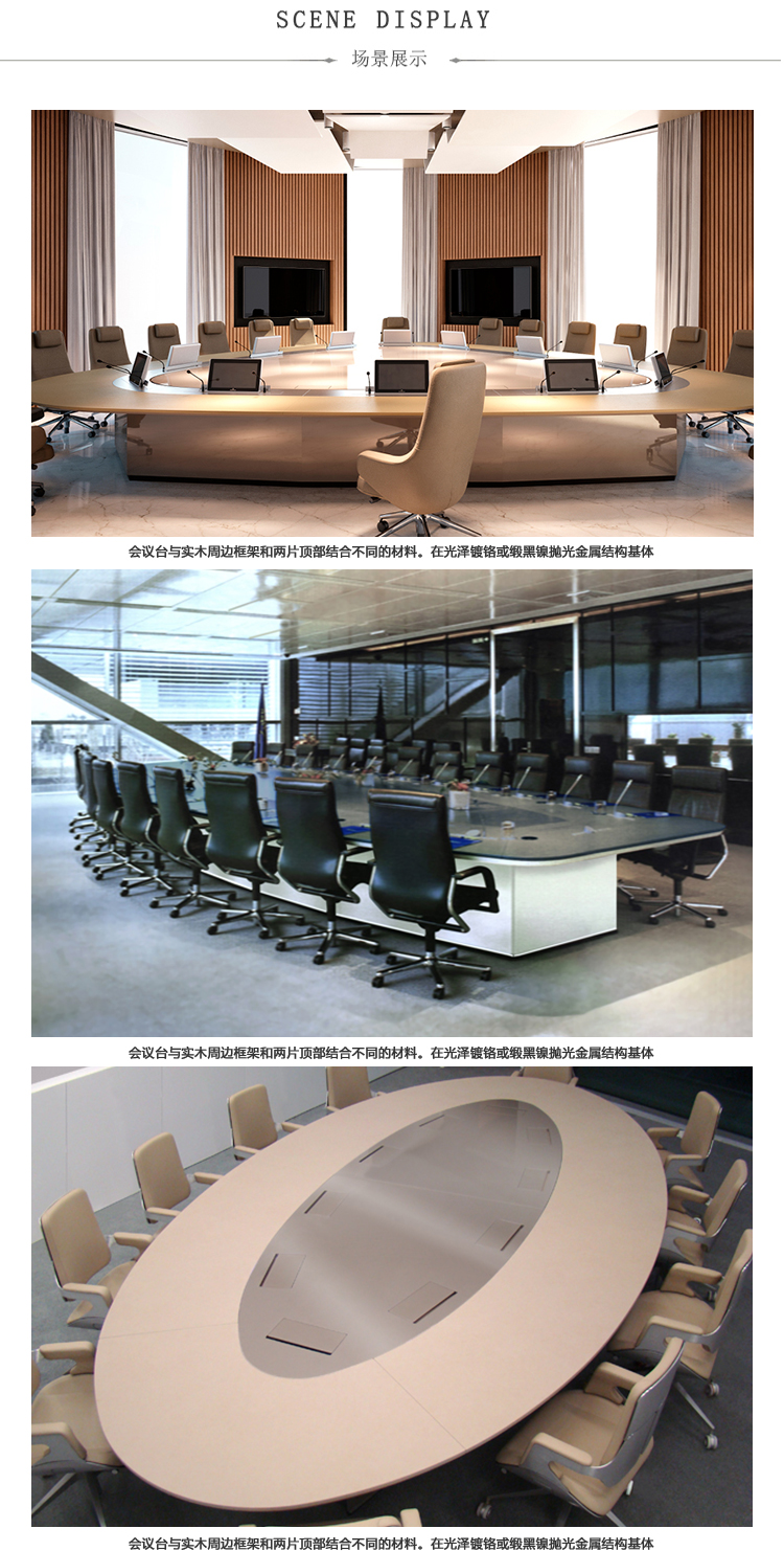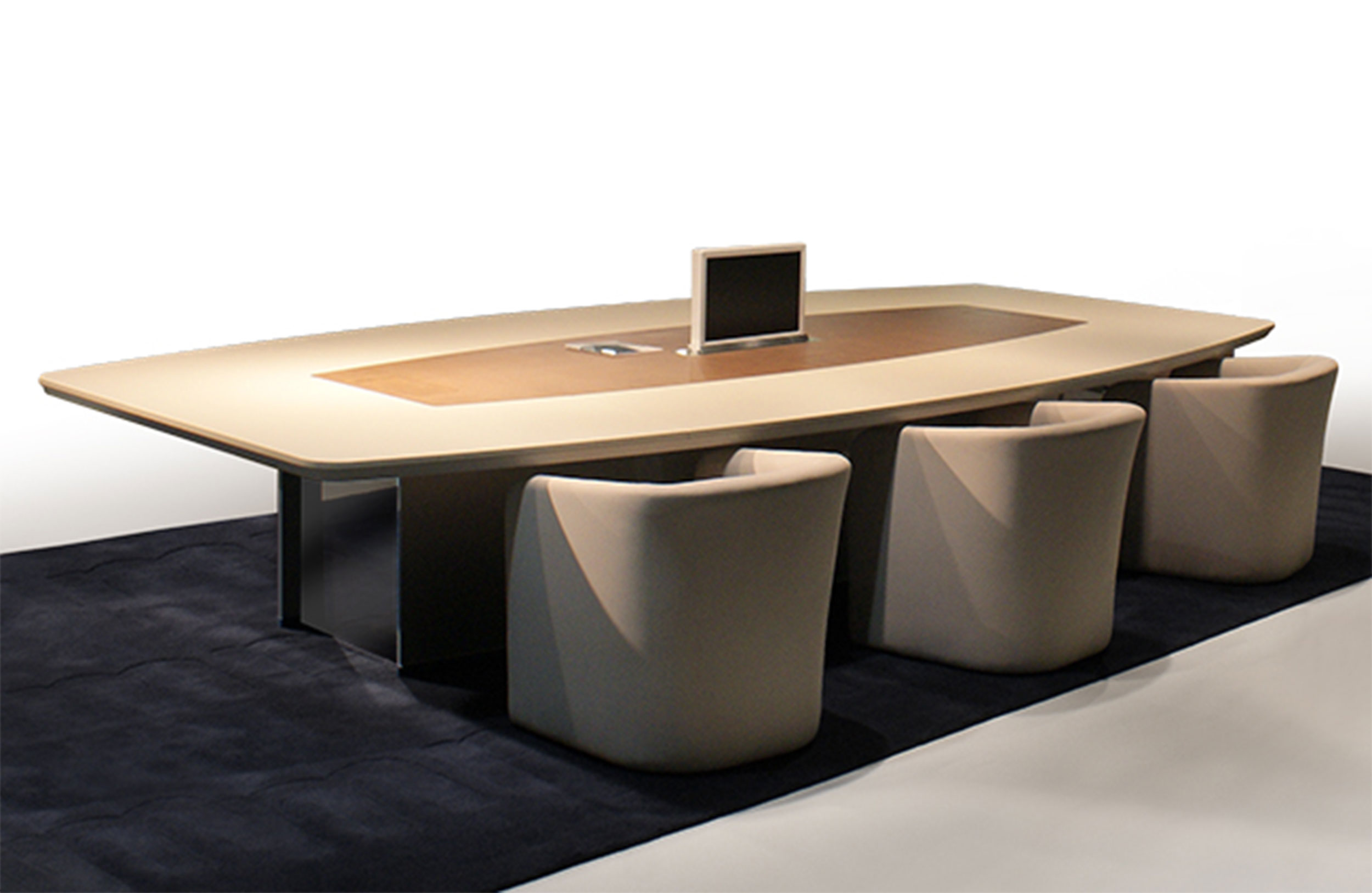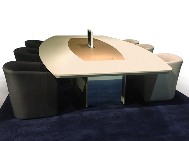 会议桌。椭圆形顶部,直头。顶部分为两个区域:中心和周边,允许不同材料和饰面的组合。50mm厚的顶部由两部分组成:盖子和45o斜面底盖。表专门设计用于集成可伸缩电脑显示器,电缆管理和电子系统的其他部分。底座由隐藏的金属结构组成,封闭有可拆卸的面板,可以方便地进入桌子内部,以便进行电缆管理和维护。表面处理:混合成品顶部采用木材,微纹理漆或Techno Leather软垫。以漆面为基础。