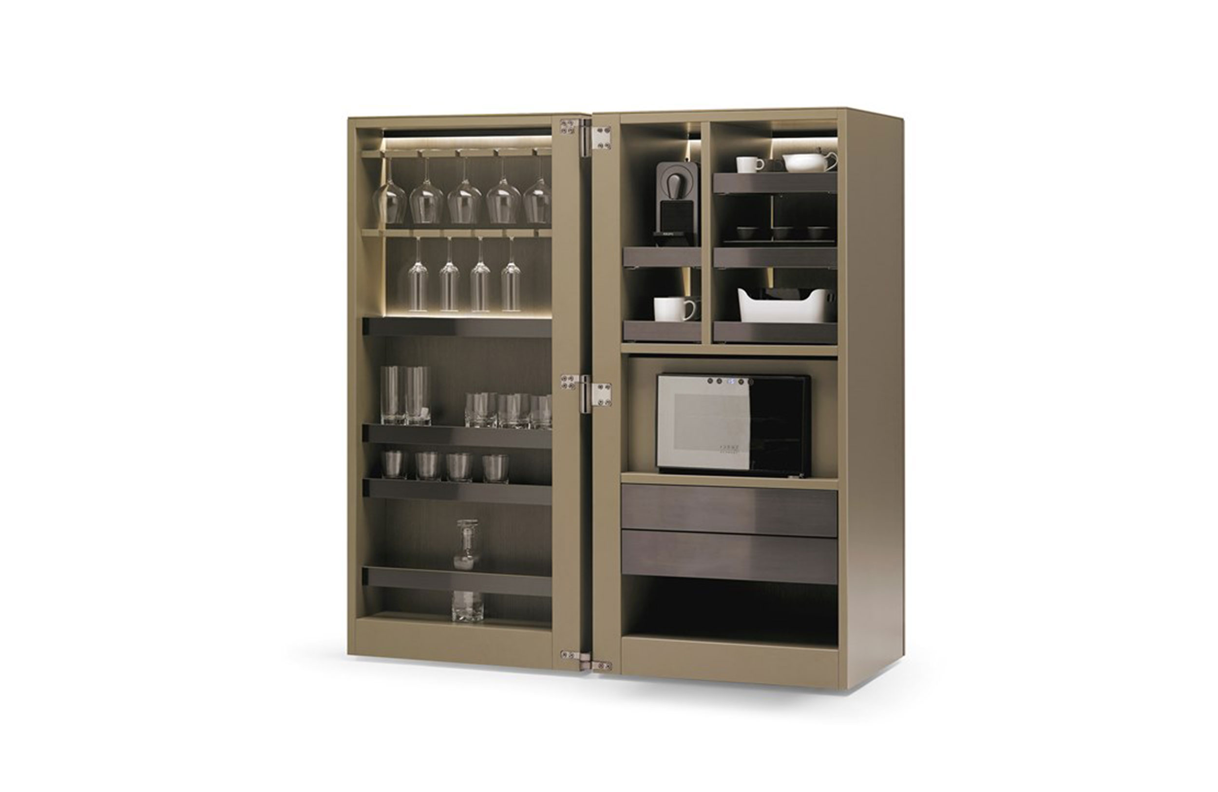 顶部,侧面门,背微膨体漆面内饰早在木材表面。在技术,皮革软垫盘彩色不锈钢。上层建筑货架和抽屉的阵地。在铰链黑镍。