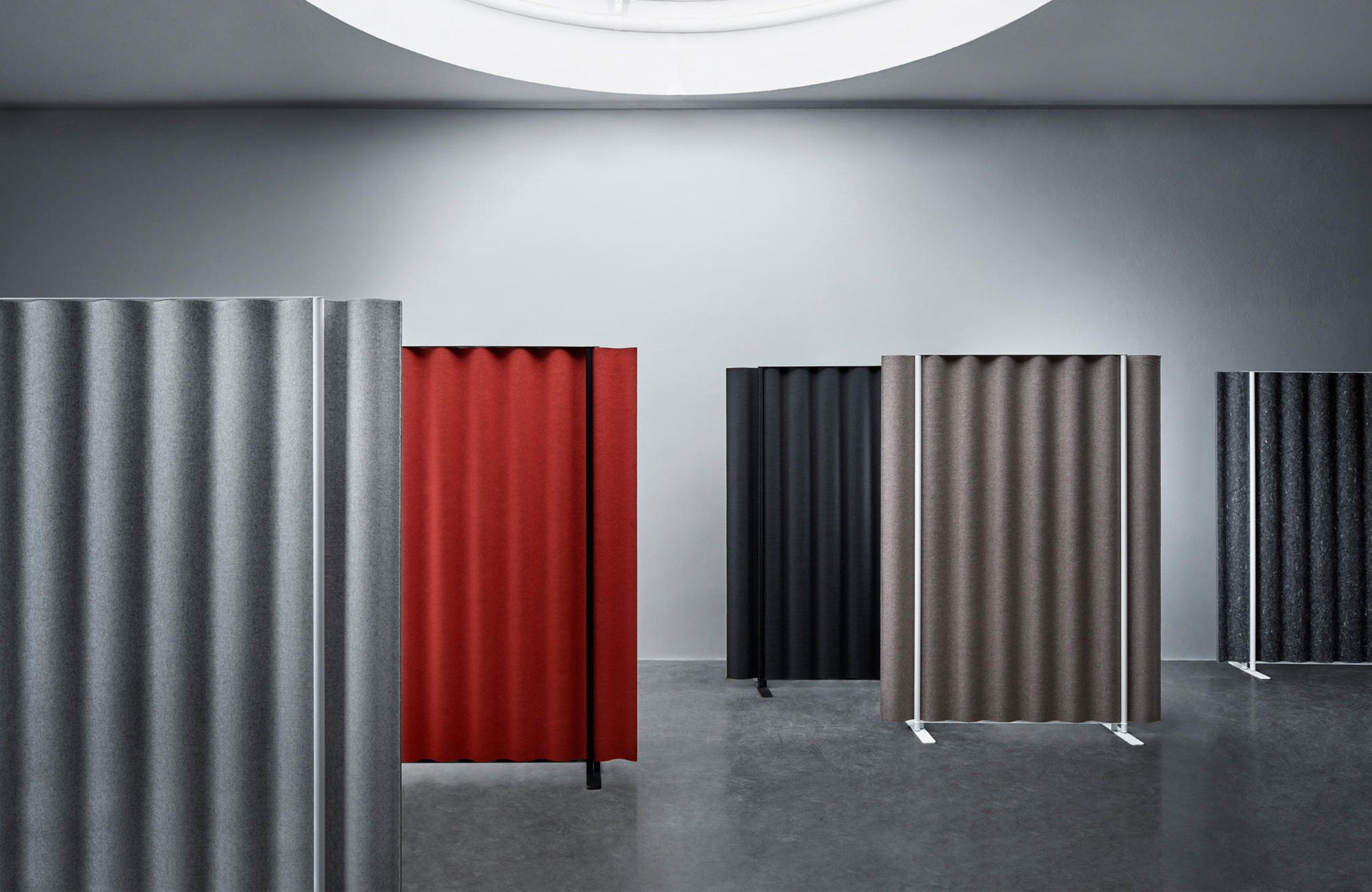 Scala是一个完整的系列屏幕。Scala可以安装在墙壁上,悬挂在天花板上,也可以作为独立式地板屏幕,桌面屏幕和悬挂室分隔板使用。对于地板和桌面屏幕,Anya Sebton开发了由钢管组成的支架,突出了设计的自发方式。