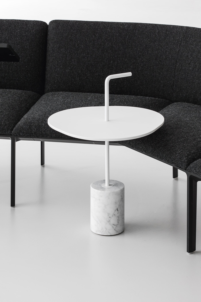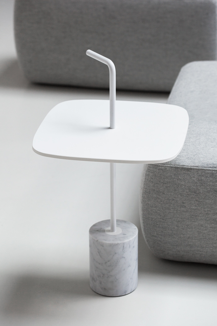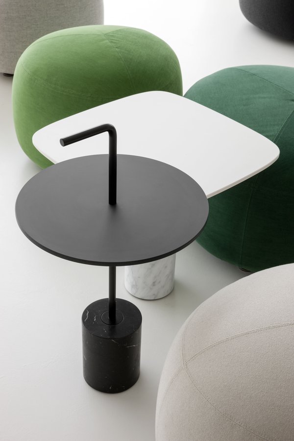JEY.稳定且可移动。它可以作为一个顶部或便携式的桌子。它有两种不同的高度(45和50厘米)和四种不同的顶部,两种材料和两种颜色。它是一种小型的桌子雕塑,有大理石或水泥底座,管状柱以各种几何图形发展成一个形状的顶部,以一个手柄结束。手柄形状的弯管可以方便地移动桌子,特别是在高频区域(如办公室、酒店、酒吧、餐馆等),但也适用于当代居住环境。它可以与扶手椅、沙发、另一张桌子或另一张Jey相匹配。
