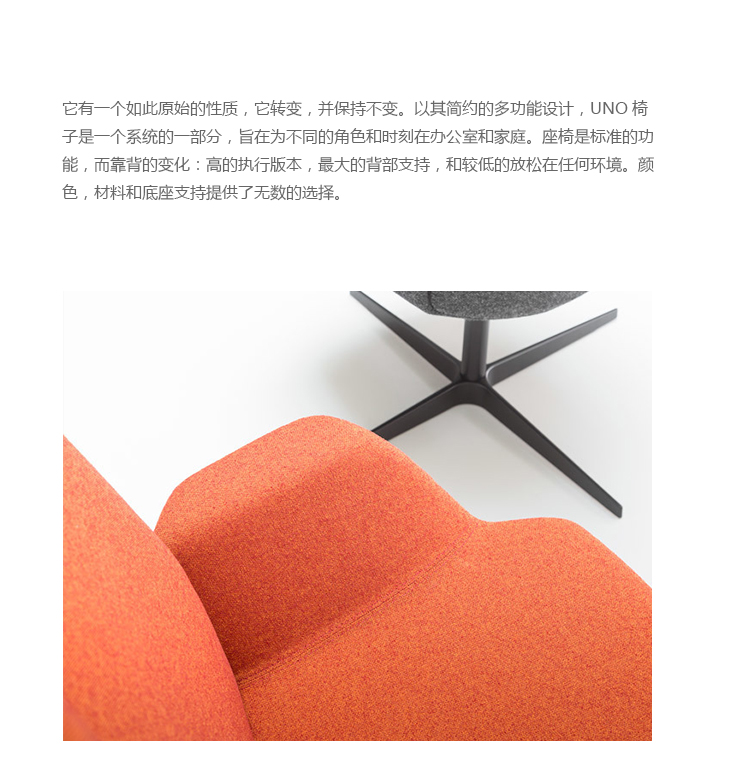 它有一个如此原始的性质,它转变,并保持不变。以其简约的多功能设计,UNO椅子是一个系统的一部分,旨在为不同的角色和时刻在办公室和家庭。座椅是标准的功能,而靠背的变化:高的执行版本,最大的背部支持,和较低的放松在任何环境。颜色,材料和底座支持提供了无数的选择。