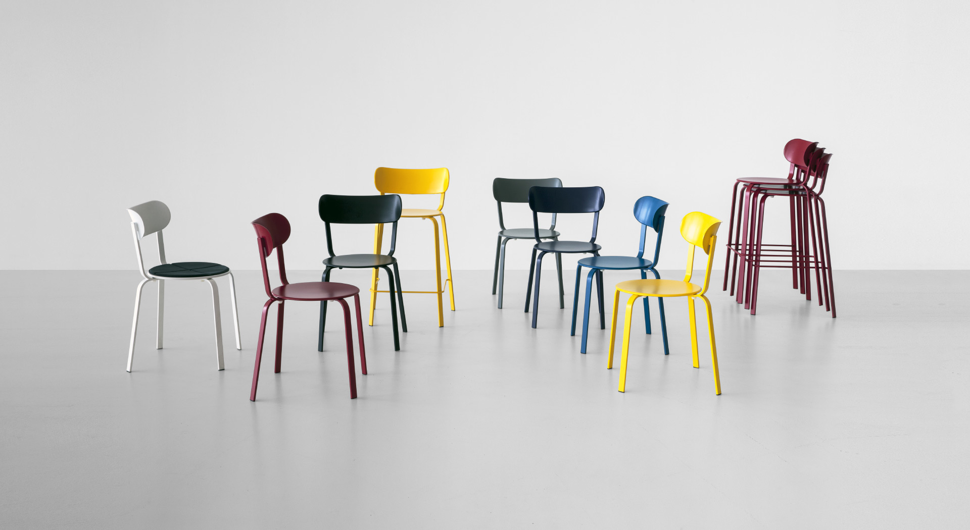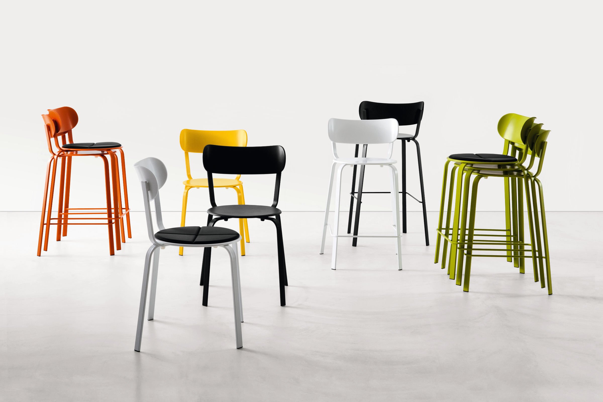 椅子和凳子- -小酒馆机型,STIL收集的光当代版本是一个非常时髦一项所述的单一材料,金属和明亮的颜色的播放允许无数组合和组合物。