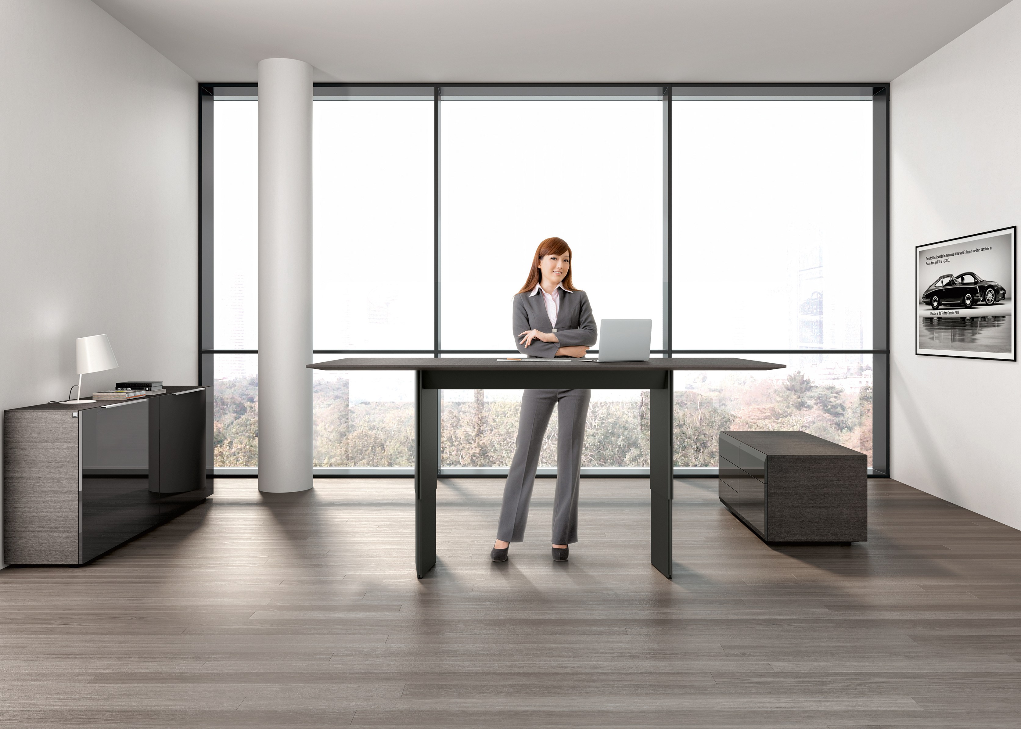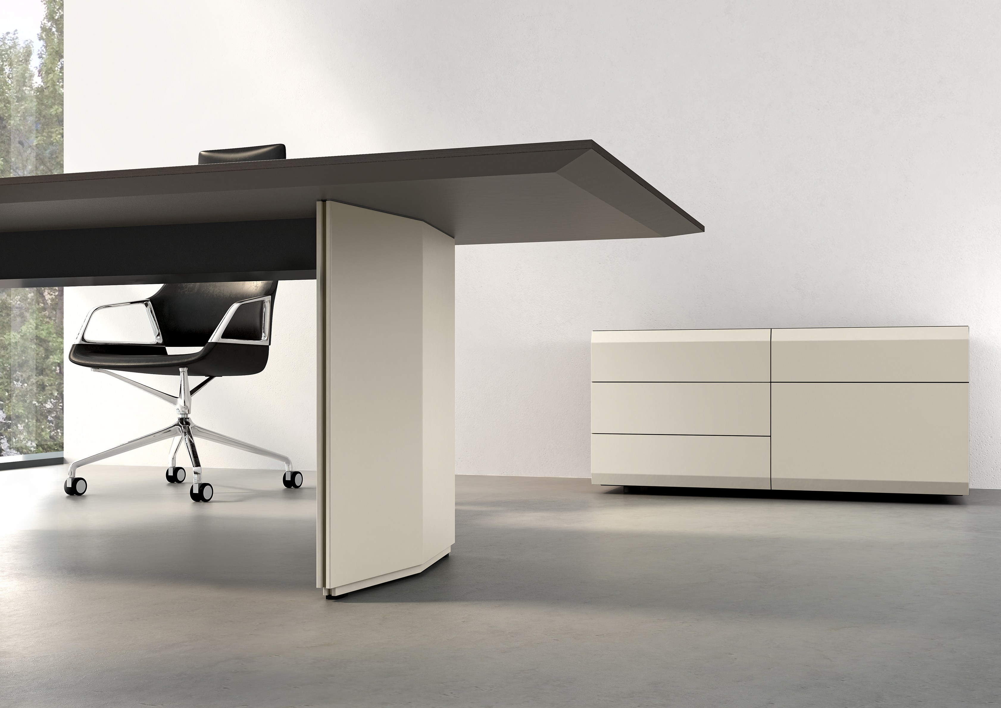 精心设计的工作表面,可调节到不同的高度,其形式在第一眼看上去就不一样了。 不显眼的功能细节连接优雅的外观和出色的做工,提供了绝对的稳定和最大的底部空间。桌面似乎漂浮在基座上, 有各种各样的尺寸,饰面和精致的贴面。电缆和驱动器隐藏在优雅的漆面漆的侧面板后面。匹配的容器和侧板是完美的补充,既增加了功能又增加了气氛。
