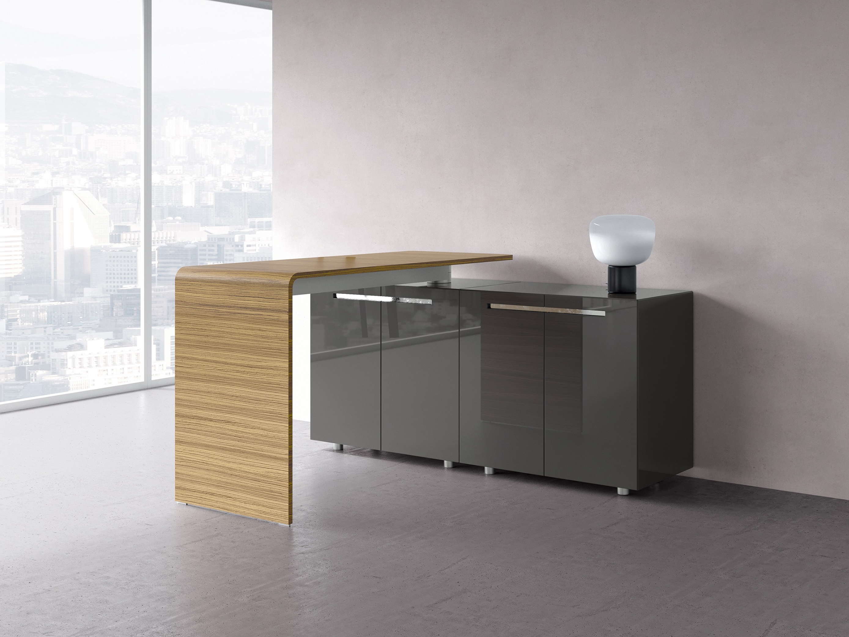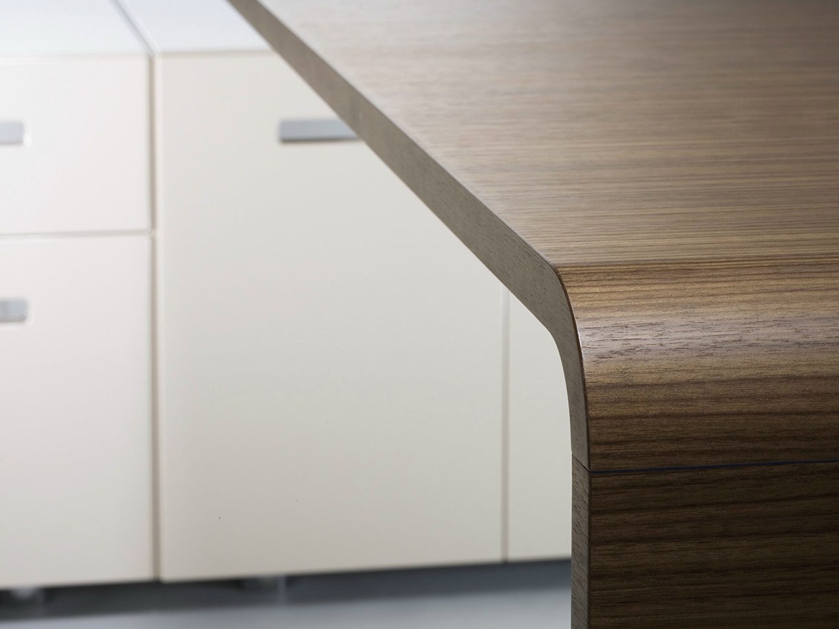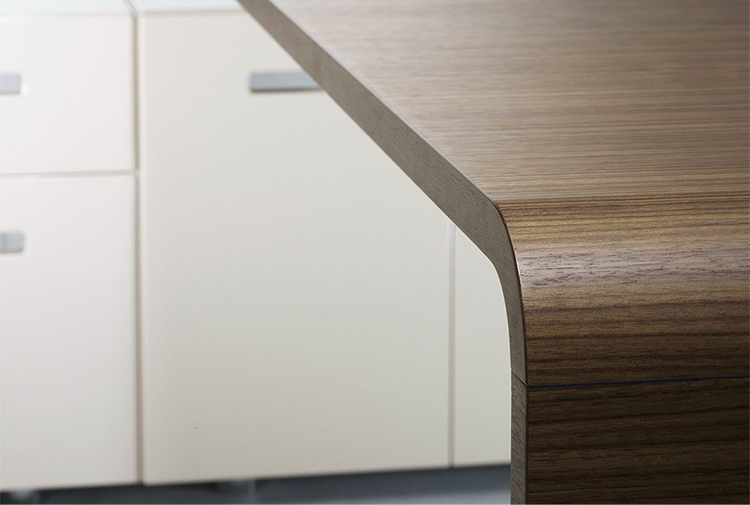 Lane 拥有一气呵成,一体成型的曲线桌面,斜纹木皮的巧用与工艺的精湛使其台面与桌脚折弯处宛如无缝式的优雅过渡,让LANE拥有无与伦比的高辩识度。