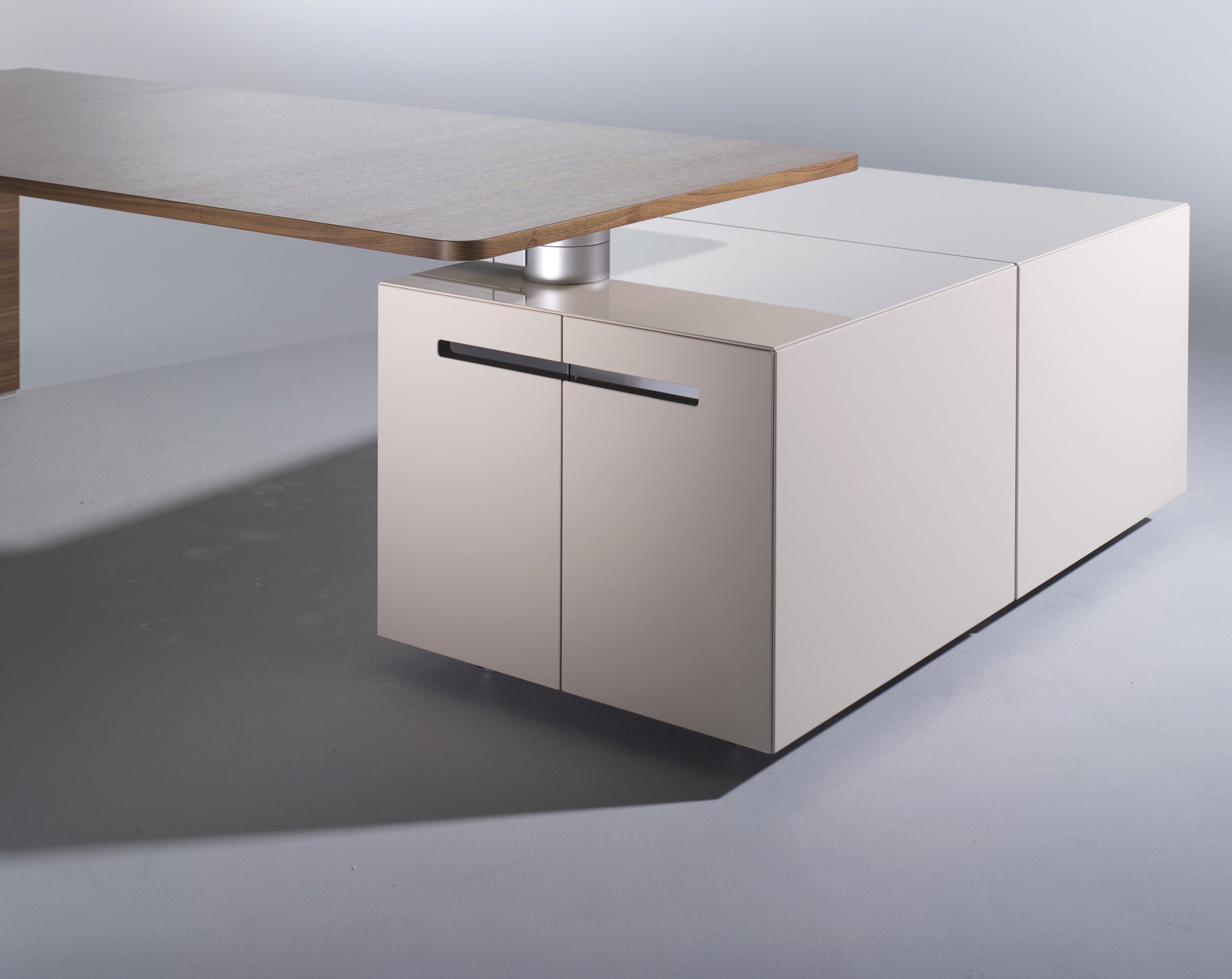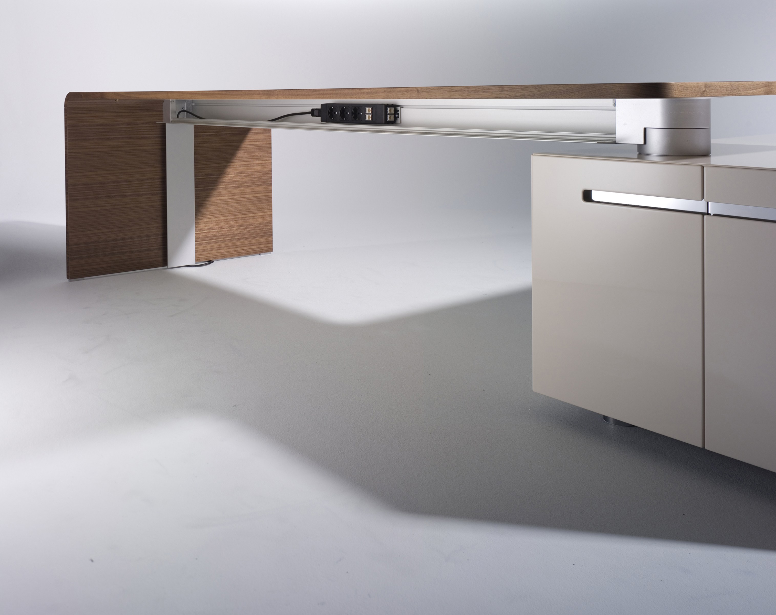 桌面与座地柜以一个枢纽连接,保证了工作位的移动性以及电源供应。桌下的铝管槽可隐藏充电器、变压器、电线等。顶部的电源管理盒可通过底柜或者沿着桌下走线槽走线,保持外观的整洁性