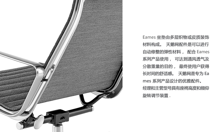 Charles与RayEames夫妇是20世纪最有影响力的设计师,卓越的设计涵盖了家具、建筑、影像与平面设计。他们从二次世界大战中美国海军的实验计画中学习经验并发展可谓是现今工业中使用模铸胶合版的先锋,这对设计界的超级夫妇档自1940年参与了由MOMA举办的有机家具设计大赛,自今已有近百件他们的作品被各大博物馆所永久典藏。 Eames® Soft Pad Side Chair(伊姆斯软包会议椅)是夫妻俩1958年设计的,是在全铝系列的基础上发展的另一系列Eames产品。舒适系列在全铝的椅架上增加了皮革制的柔软坐垫和靠背,高级铝合金制作,压模四星脚,可旋转。背垫和坐垫,采用西皮,具有透气性强,内部填充高密度定型绵,不易变形,不老化,依人体坐姿,符合人体工学,耐水及对人体无害等优势。椅子扶手选用优质电镀铝合金扶手,手感舒适,永久不生锈。转椅底盘为多功能底盘,可以保护使用者长时间坐用腿部健康,且作为高度可多定位调节。气压棒采用的气杆是正规厂家出产的外贸气杆,每一根气杆都有钢印,经过严格SGS检测的才可出厂,旋转、升降自如基本无声响,使用寿命长,可承受250kg,可升降数万次,将椅面调至与膝盖同高时,使用者坐下后双脚跟可垂直平放于地上,且大腿与地面平行,最符合人体工学理论,使用者长期久坐,也不想疲惫。办公椅脚为铝合金材质永久不生锈、承受能力强,安全更放心。椅子脚轮采用优质电镀片脚轮,耐用而美观,可以随意变换位置,贴心更方便,具有防震及防松脱,让椅子的安全性能更加可靠。