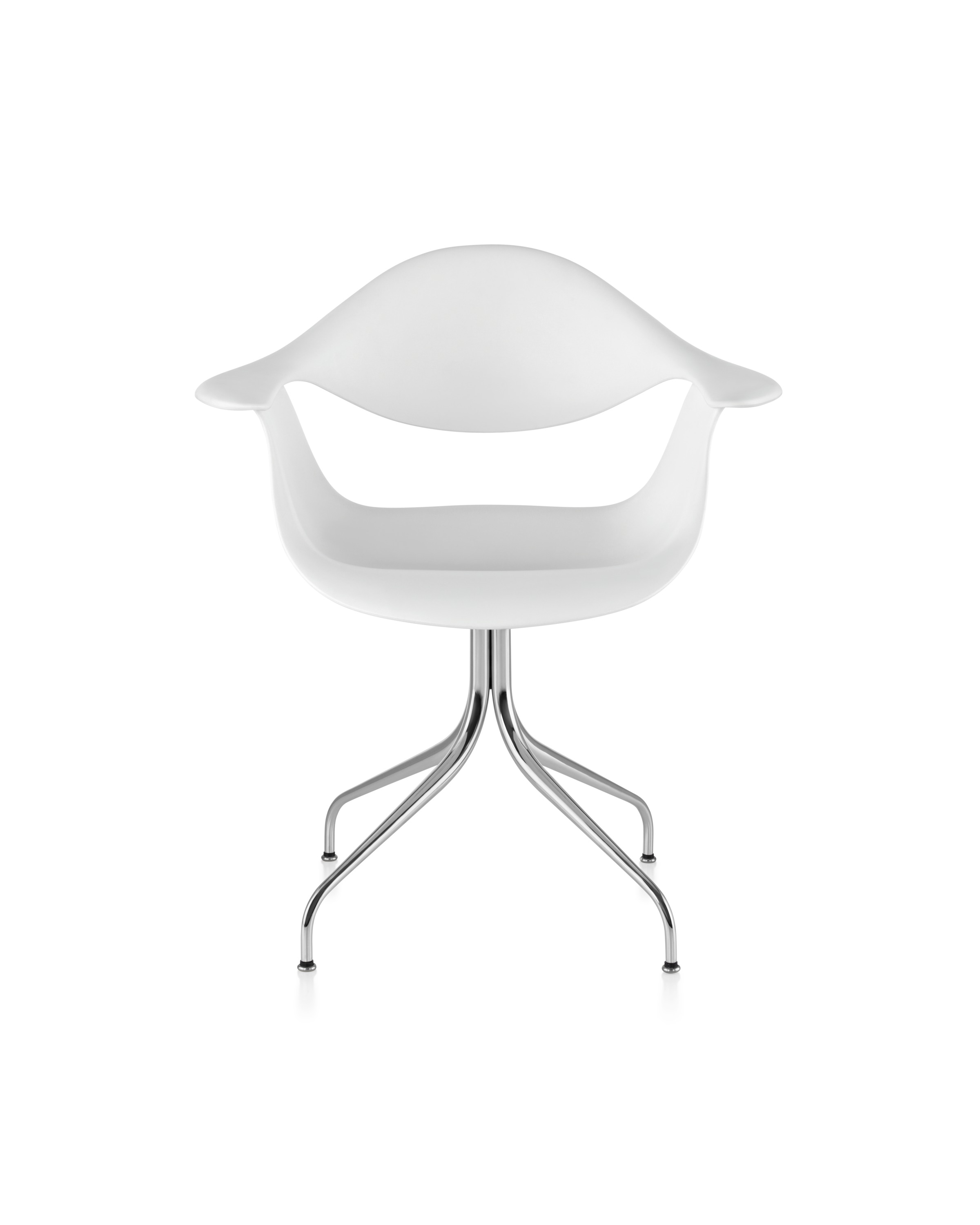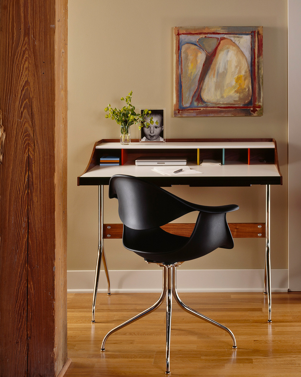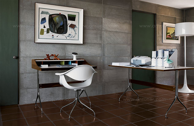这款扶手椅所属系列的灵感来自George Nelson对创作一款具有雕刻感椅腿家具的渴望,并且他对椅腿的形状有非常具体的想法。George Nelson希望底座具有优雅的曲线,采用金属材料制造,工业加工成型,并且采用预处理饰面,同时要容易组装和分解,以方便装运,并且价格更便宜。型锻是用压力细化并弯曲金属管的过程。实践证明这是制造椅腿的绝好工艺,而Nelson也是用这种工艺为自己的独特设计命名。 对于椅座壳,Nelson将单独的椅座和靠背组合在一起,形成雕刻般的形状,以贴合人体曲线。椅背和椅身之间的缝隙可以避免产生过高的热量。宽阔平坦的扶手可以让手臂处于放松状态。放置在办公桌或是用餐区或会议室的桌子旁边,这款永恒时尚的座椅能够满足当今的需要,如同1958年刚刚推出时一样。