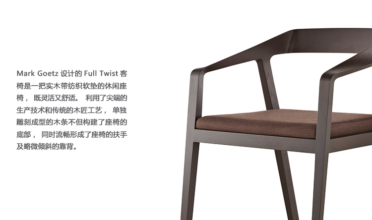 Mark Goetz设计的Full Twist客椅是一把实木带纺织软垫的休闲座椅,既灵活又舒适。利用了尖端的生产技术和传统的木匠工艺,单独雕刻成型的木条不但构建了座椅的底部,同时流畅形成了座椅的扶手及略微倾斜的靠背。简约优雅的线条使Full Twist客椅可以广泛适用于商业空间,包括私人办公室、会议区及家居场所。此款座椅由Geiger制造,具有实木及座套的完整系列,可以提供无限可能,与任何室内空间相匹配。