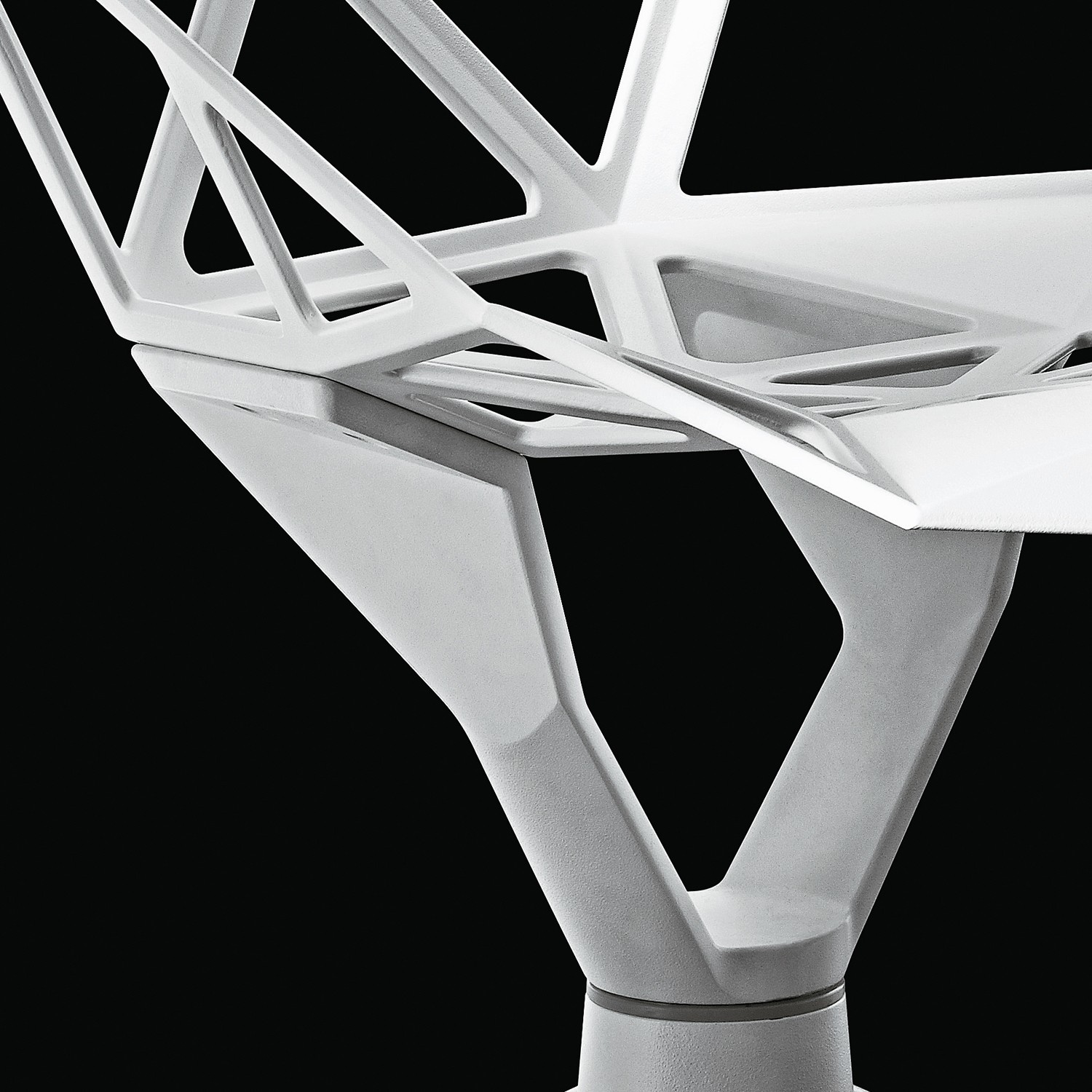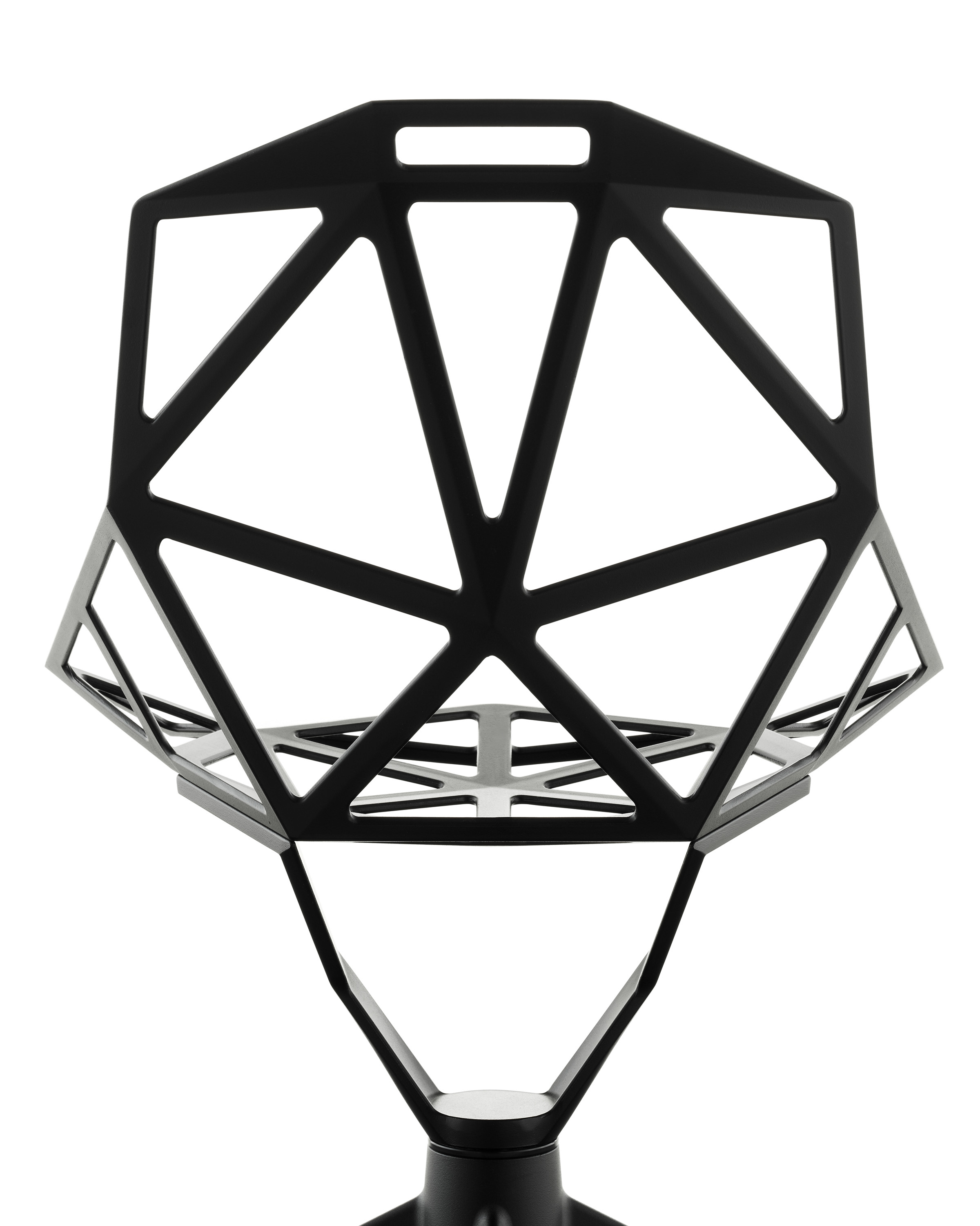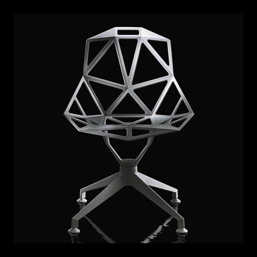 最受瞩目的德国设计师Konstantin Grcic 应邀为MAGIS 设计的Chair One(几何吧椅),是设计生涯中最具有标志的产品之一。办公椅体为模铸铝合金结构,经过氟化钛镀膜与塑料粉末涂布。椅子具有阻燃性、抗腐蚀性。适合室内及室外使用。以铝金属与钛金属制成的 Chair One,以多个平面以不同角度组合而成,建立起立体的外型。多个中空的三角型组合而成的座椅,不但令为用家带来强而有力的承托结构,而且还能在简单设计之中带出不一样的风格。这把椅子的惊人形象难免使人对它的舒适度产生疑问,但当你真正坐于其上,你会发现它实际上非常舒适,那些稀疏的网状结构能够极好地支撑不同体型的人体,后背上的把手也非常实用。当你知道Chair-One最初是被当作户外用椅而设计的,你会更加佩服Konstantin Grcic的缜密用心:极少的表面可以杜绝雨水,并且减少灰尘堆积,夸张的形态则令它能够在街道、建筑或自然的环境中拥有自己美学上的存在,而不是被环境所吞没。Konstantin Grcic花了三年时间设计Chair One,自2003年诞生以来,堪称Grcic精简主义风格的代表作。2006年,Chiar One为Konstantin Grcic赢得了德国政府的设计大奖。