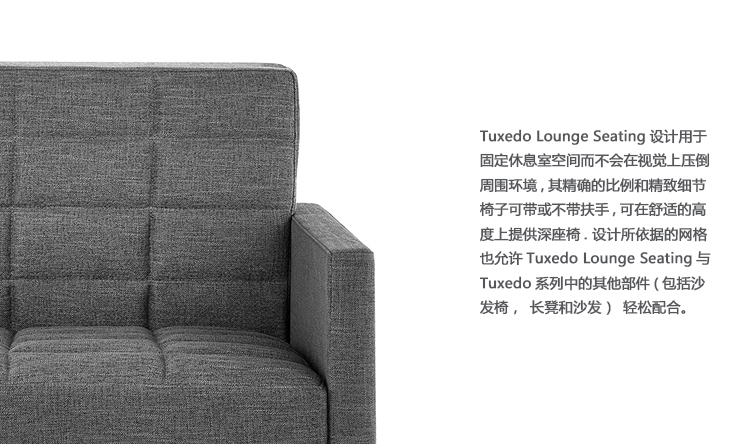 Tuxedo Lounge Seating设计用于固定休息室空间而不会在视觉上压倒周围环境,其精确的比例和精致细节。椅子可带或不带扶手,可在舒适的高度上提供深座椅。设计所依据的网格也允许Tuxedo Lounge Seating与Tuxedo系列中的其他部件(包括沙发椅,长凳和沙发)轻松配合。