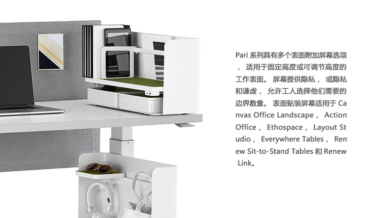 Pari是一个屏幕系列。 有些版本是独立式的,有些版本是贴在表面或框架上的,所有版本都是可粘的,并且共享无框架,薄的外形。 它们一致的细节和互补的颜色有助于美学的连续性,因为它们描绘了空间并提供了隐私。 Pari Screens与许多Herman Miller产品兼容,可在办公室环境中进行设置。 使用Pari Screens,组织可以压缩工作站并在较低的墙壁高度进行标准化,而不会牺牲员工所需的隐私,以便他们可以集中注意力,或创建个人空间的边界让他们感到舒适。