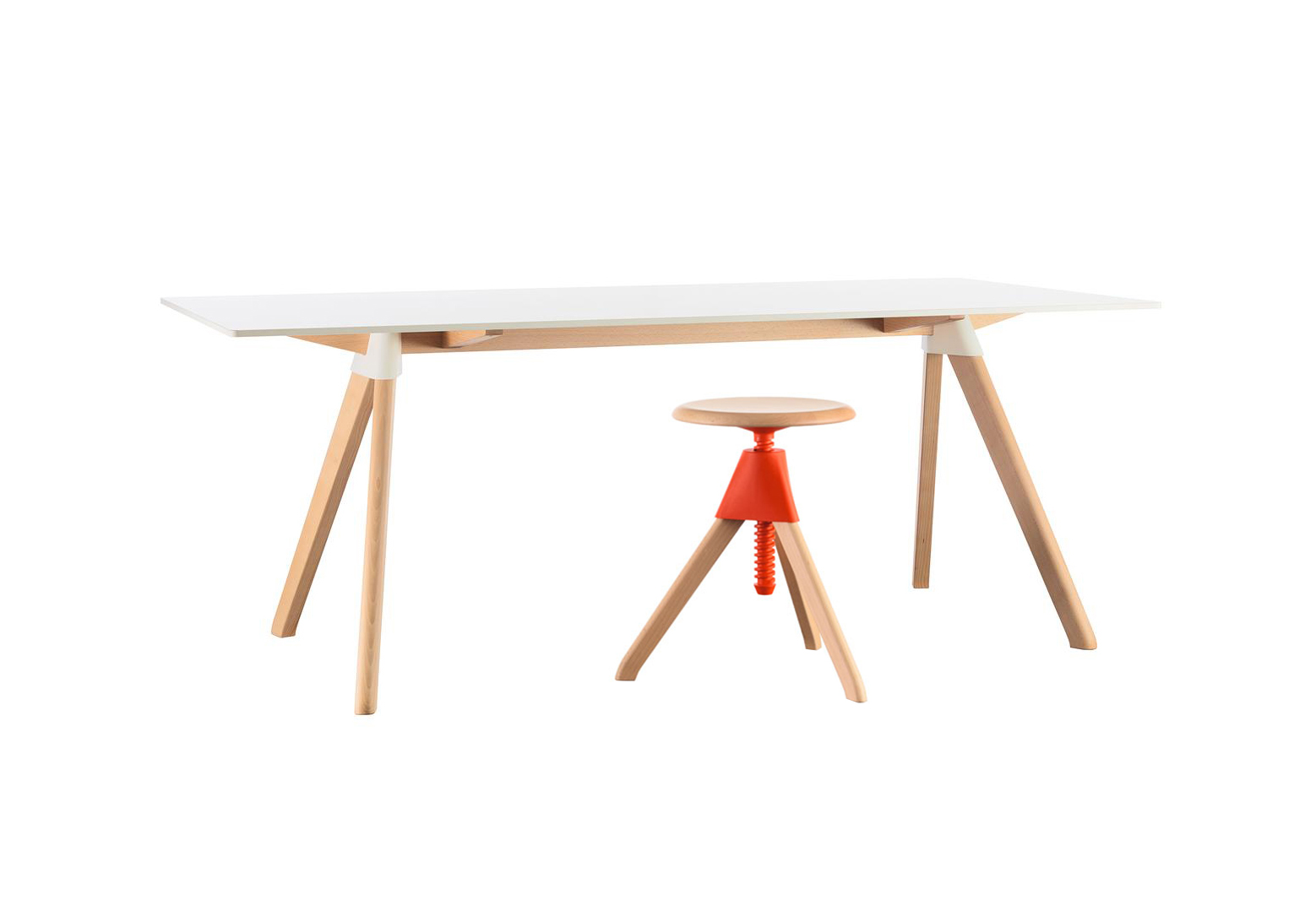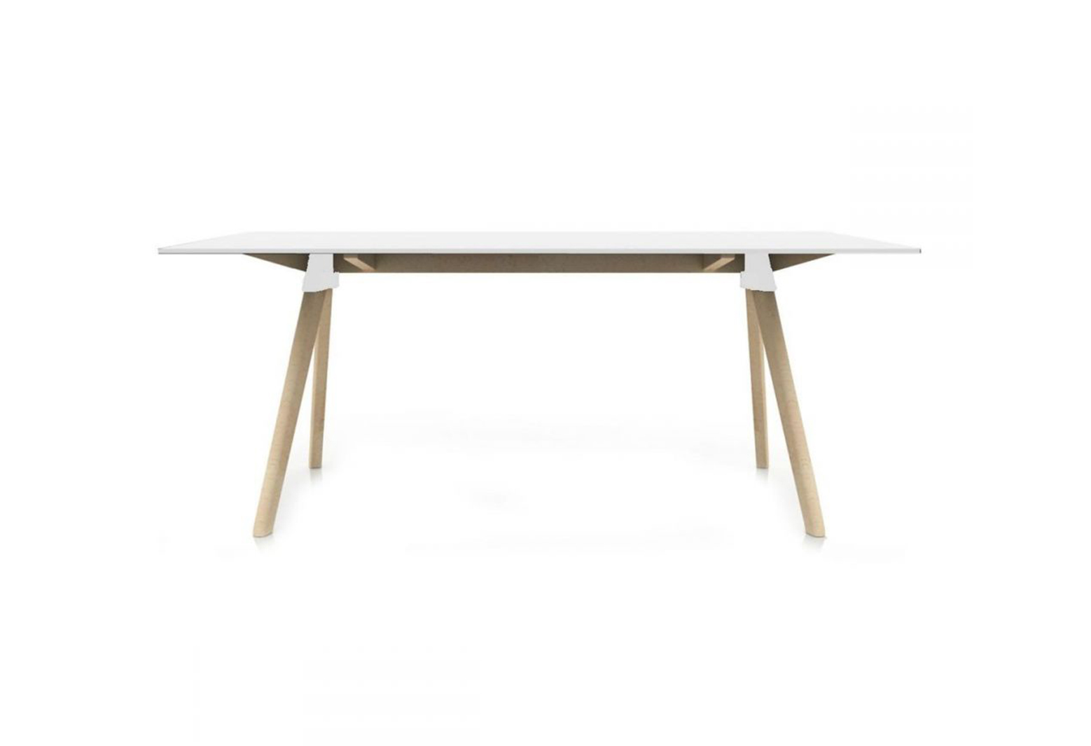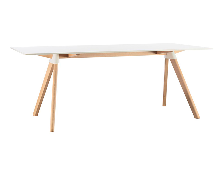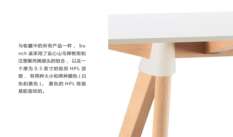 与系列中的所有产品一样,Butch table的特色是一个实心山毛榉框架和注塑聚丙烯接头,以及一个矩形的HPL(0.5英寸厚)顶部,有两种尺寸和两种颜色(白色和黑色)可供选择。黑色的HPL上衣可以防指纹。