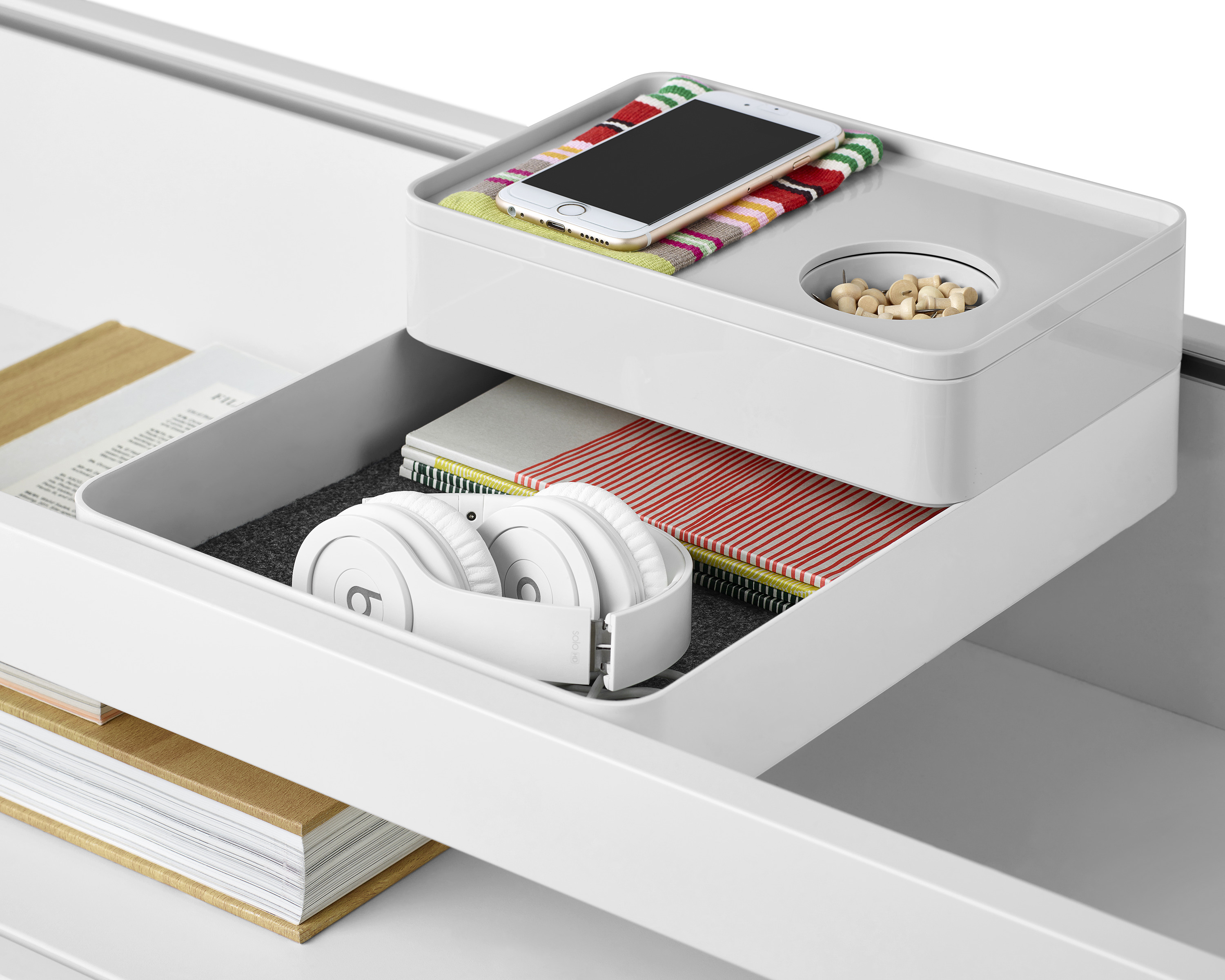 考虑到占据家庭及办公室空间的笨重物品的存放问题,Sam Hecht和Kim Colin设计了具有可拆卸盖子的储物盒。每个盖子上设计有孔洞,可供放置移动式笔筒。或者,笔筒可固定于储物盒内部孔洞下方压槽中,从而在无需打开盖子的情况下便可接触杯中物品。