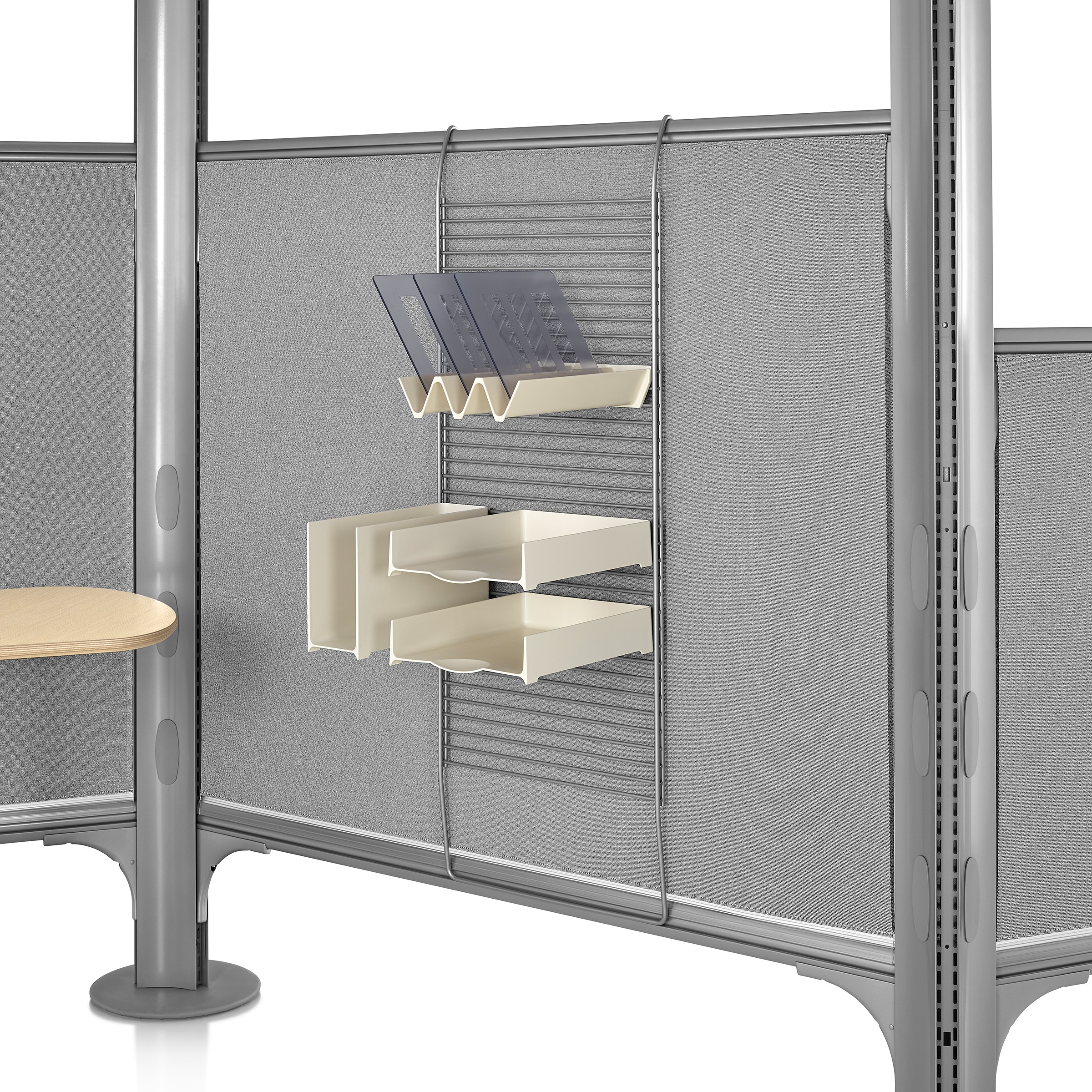 强大到足以容纳活页夹,电话簿和文件夹。保持直立以便于使用。钢轨连接或独立的。