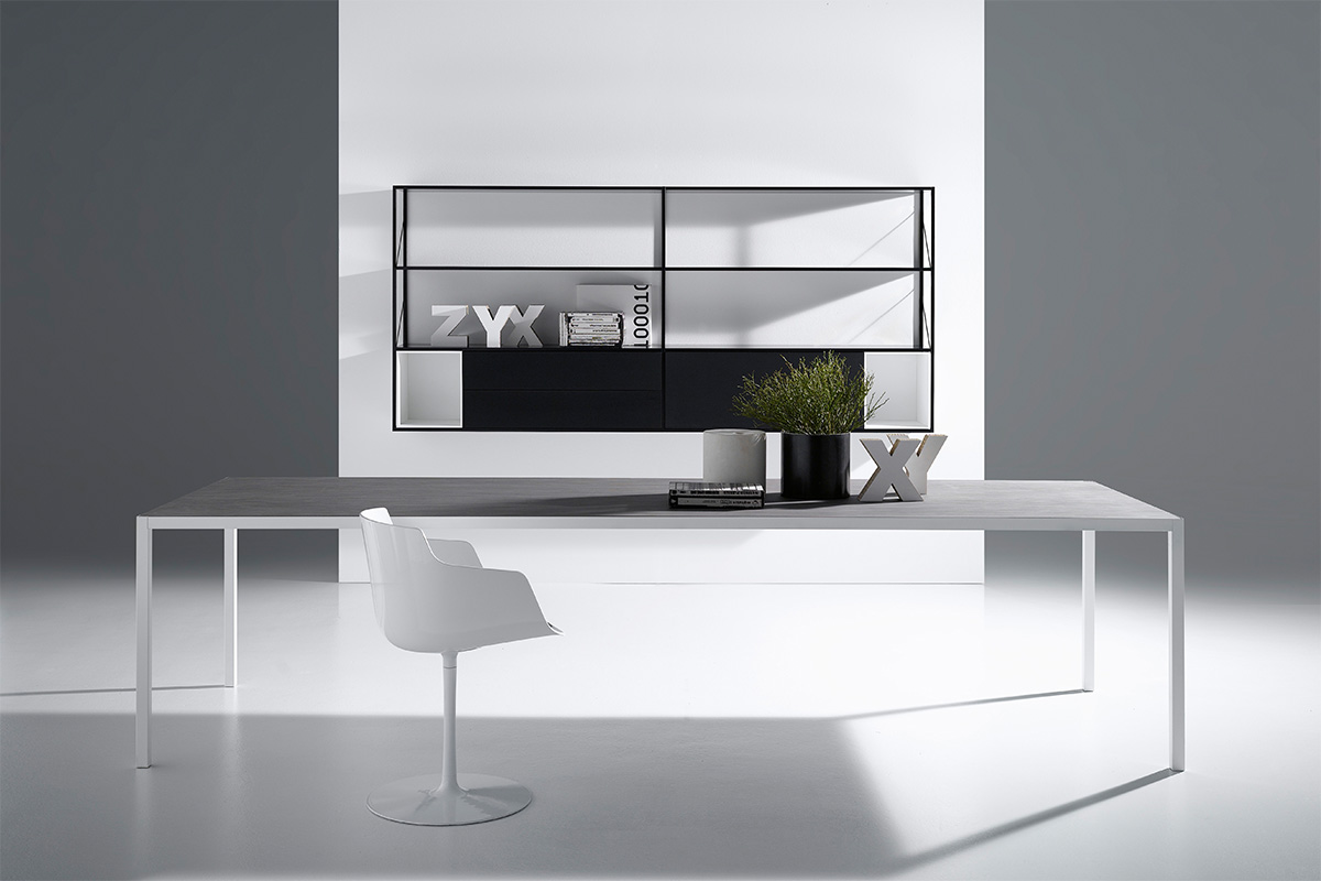 Minima 3. 0:三个代表组成系统的三个关键元素:架子,框架和橱柜。Essential和flible,Minima3。0代表Minima的自然修饰,MDF Italia系列的标志性产品,特别提及在1998年第十七届Compasso D'Oro ADI展览会上。技术和创新使这种厚度仅为15 mm的薄铝结构提出了越来越小而又坚固的标识。相当长的挤压铝制架子与加入系统后,就可以扩展该系统的长度,使其适应各种环境:住宅,办公室,社区区域,合同…。模块化和灵活,即使有了新型的存储单元,也可以适应各种环境。这可以与开门,门,盖门或抽屉一起使用。它们只是放置在建筑物内部,并且很容易重新放置,因此可以满足所需的任何存储要求,并可以使用不同的颜色,木材和形状来选择自己的生活方式。黑色或白色,上漆的或木制的,这些是极简主义的许多变量,是真正的模块化结构原型,是必不可少的或彩色的,线性的或整体的。 结构 立柱和通过使用隐藏接合系统,能够提供结构稳定性和负载特殊电阻由挤压铝制成,并组装在一起货架表面处理:无光泽漆白色和石墨灰。 类型学 可提供独立式和悬挂式版本,深度始终为33厘米。铝制框架,第1节。5x1。5厘米,搁板1。5厘米厚,可提供标称长度60、90和120厘米。端部框架配有挤压式铝制压力盖。极小值3.独立式版本的0共有6种高度:42。5厘米,79厘米,115。5厘米,152厘米, 188. 5厘米和225厘米; 第一个架子放在离地面4. 2厘米的位置,而立柱则配有可调节的铝制脚,公差为+/- 1. 5厘米。隔室的内部高度为35厘米。最小3 。悬挂版本中的0共有四个高度:38 cm,74。5 cm,111 cm和147. 5 cm。隔层的内部高度为35 cm。Minima3。0完全由100制成%可回收铝。
