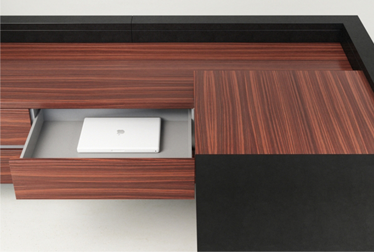 左副台带主机柜;左副台抽屉中可安装笔记本底座;右副台为储物柜.