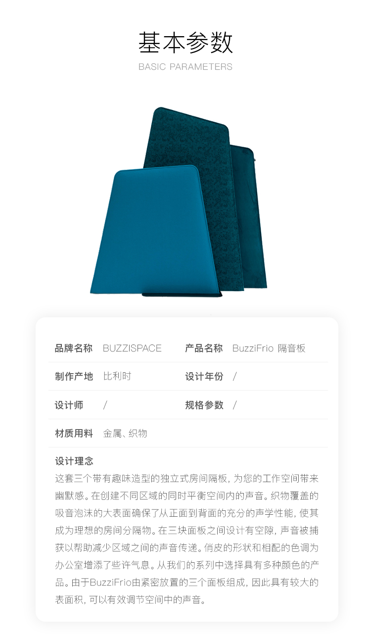 这套三个带有趣味造型的独立式房间隔板,为您的工作空间带来幽默感。在创建不同区域的同时平衡空间内的声音。织物覆盖的吸音泡沫的大表面确保了从正面到背面的充分的声学性能,使其成为理想的房间分隔物。在三块面板之间设计有空隙,声音被捕获以帮助减少区域之间的声音传递。俏皮的形状和相配的色调为办公室增添了些许气息。从我们的系列中选择具有多种颜色的产品。由于BuzziFrio由紧密放置的三个面板组成,因此具有较大的表面积,可以有效调节空间中的声音。