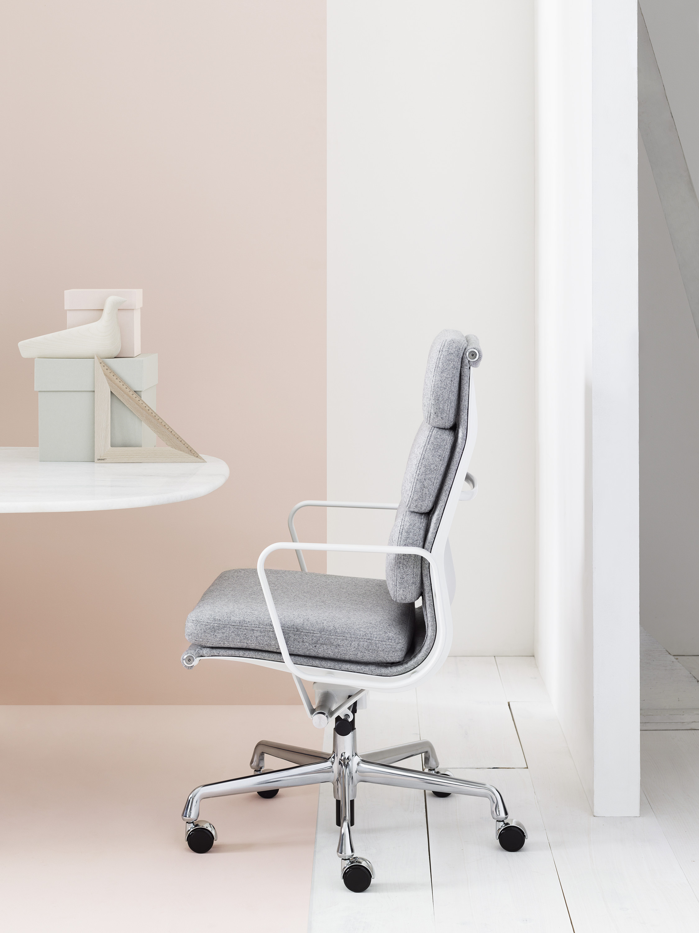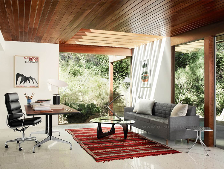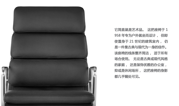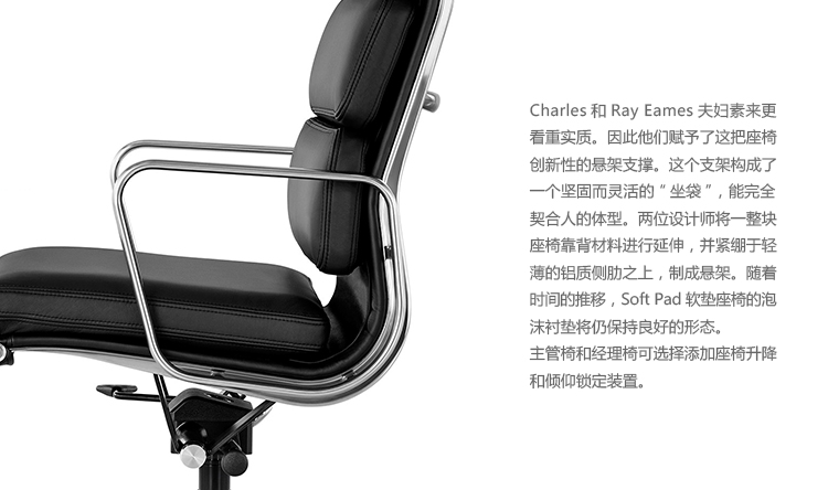 Charles与RayEames夫妇是20世纪最有影响力的设计师,卓越的设计涵盖了家具、建筑、影像与平面设计。他们从二次世界大战中美国海军的实验计画中学习经验并发展可谓是现今工业中使用模铸胶合版的先锋,这对设计界的超级夫妇档自1940年参与了由MOMA举办的有机家具设计大赛,自今已有近百件他们的作品被各大博物馆所永久典藏。Eames® Soft Pad Executive Chair(伊姆斯软包大班椅)是夫妻俩1958年设计的,是在全铝系列的基础上发展的另一系列Eames产品。舒适系列在全铝的椅架上增加了皮革制的柔软坐垫和靠背,高级铝合金制作,压模五星脚,可旋转。背垫和坐垫,采用西皮,具有透气性强,内部填充高密度定型绵,不易变形,不老化,依人体坐姿,符合人体工学,耐水及对人体无害等优势。椅子扶手选用优质电镀铝合金扶手,手感舒适,永久不生锈。转椅底盘为多功能底盘,可以保护使用者长时间坐用腿部健康,且作为高度可多定位调节。气压棒采用的气杆是正规厂家出产的外贸气杆,每一根气杆都有钢印,经过严格SGS检测的才可出厂,旋转、升降自如基本无声响,使用寿命长,可承受250kg,可升降数万次,将椅面调至与膝盖同高时,使用者坐下后双脚跟可垂直平放于地上,且大腿与地面平行,最符合人体工学理论,使用者长期久坐,也不想疲惫。办公椅脚为铝合金材质永久不生锈、承受能力强,安全更放心。椅子脚轮采用优质电镀片脚轮,耐用而美观,可以随意变换位置,贴心更方便,具有防震及防松脱,让椅子的安全性能更加可靠。