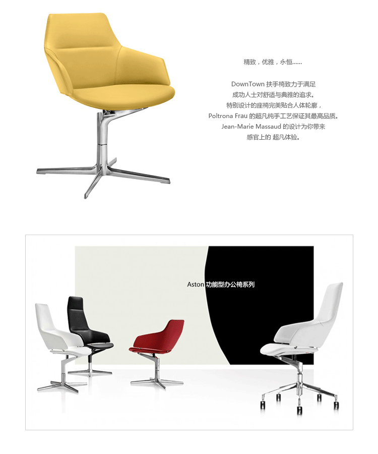 2006年法国知名建筑师 Jean-Marie Massaud(吉恩马利·马索得)与意大利家具厂 ARPER 合作推出 Aston( 阿斯顿) 系列功能型办公椅,简约立体的流线融入符合人体工学及空气动力学的结构设计,摆脱传统办公椅单调冷硬的刻板印象,达到舒适久坐的基本需求,并陆续发展出全系列适合各种需求的款式。