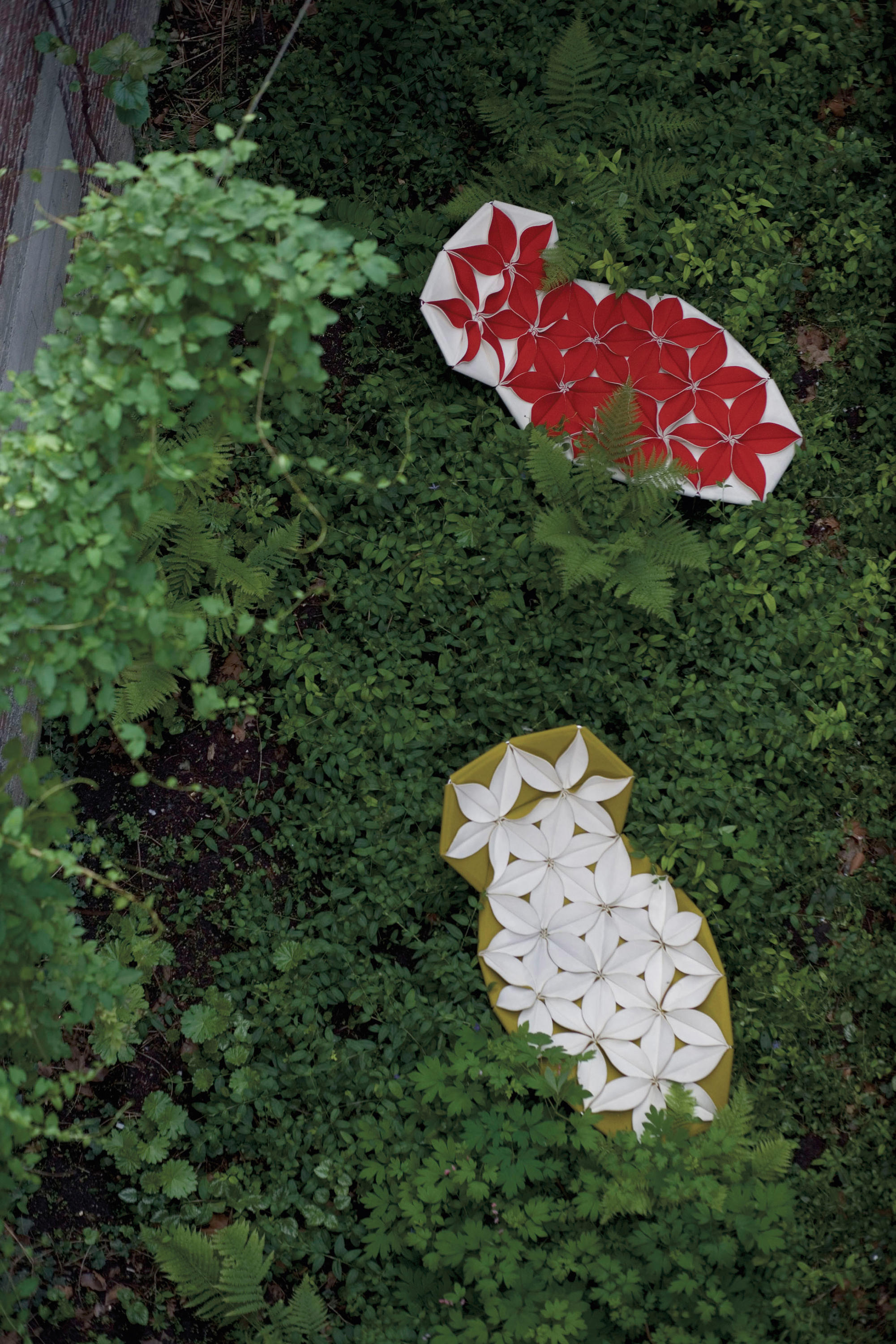 Antibodi 是 Patricia Urquiola 從一個花朵盛開的概念所創作的椅子,蜂窩式三角形花瓣串連縫製而成花朵散播在椅面上,片片花瓣的外型和多層次的材料,衍伸出豐富的圖案。