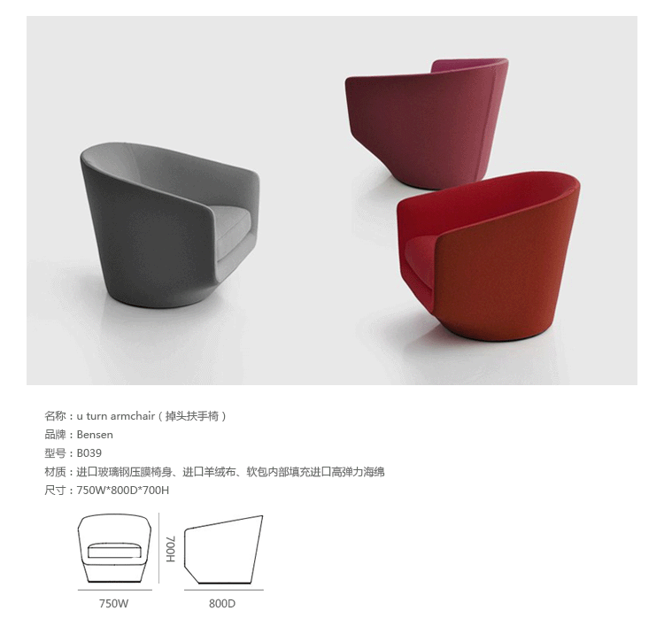 U Turn Armchair(掉头扶手椅)是Niels Bendtsen设计的可360度旋转的扶手椅,与Low Turn Armchair(掉头扶手椅)同一系列。U Turn是我们熟悉的俱乐部椅原型的演化。其精致的设计造型使它能够被用于各种各样的审美环境使用,无论是传统的传统抑或最现代的。其最具视觉特殊的元素是其可提供更广的脚步伸展空间,宽大的座位及靠背,奢华的弹性坐垫提供及其舒适的坐感,简洁利落的几何线条赋予U Turn Armchair雅致的摩登感,进口玻璃钢压膜椅身、进口羊绒布、软包内部填充进口高弹力海绵,提供最佳的舒适度。椅身织布可拆卸,方便清洗。