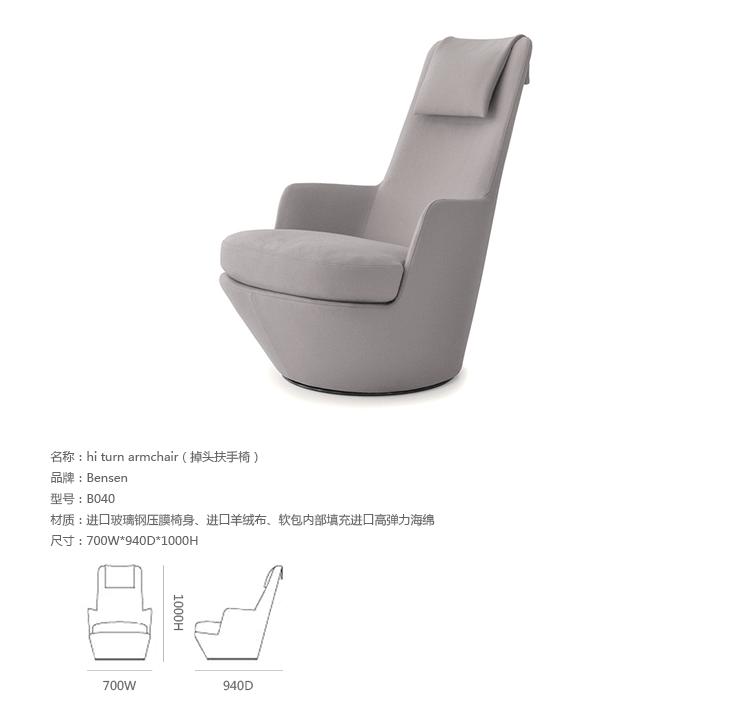 Hi Turn Armchair(掉头扶手椅)是Niels Bendtsen设计的可360度旋转的扶手椅,是受其同系列U Turn Armchair(掉头扶手椅)的启发进行造型设计的,除了保持U Turn Armchair(掉头扶手椅)的各种特点外,特别增加了靠背的高度,依座更舒适。进口玻璃钢压膜椅身、进口羊绒布、软包内部填充进口高弹力海绵,提供最佳的舒适度。椅身织布可拆卸,方便清洗。