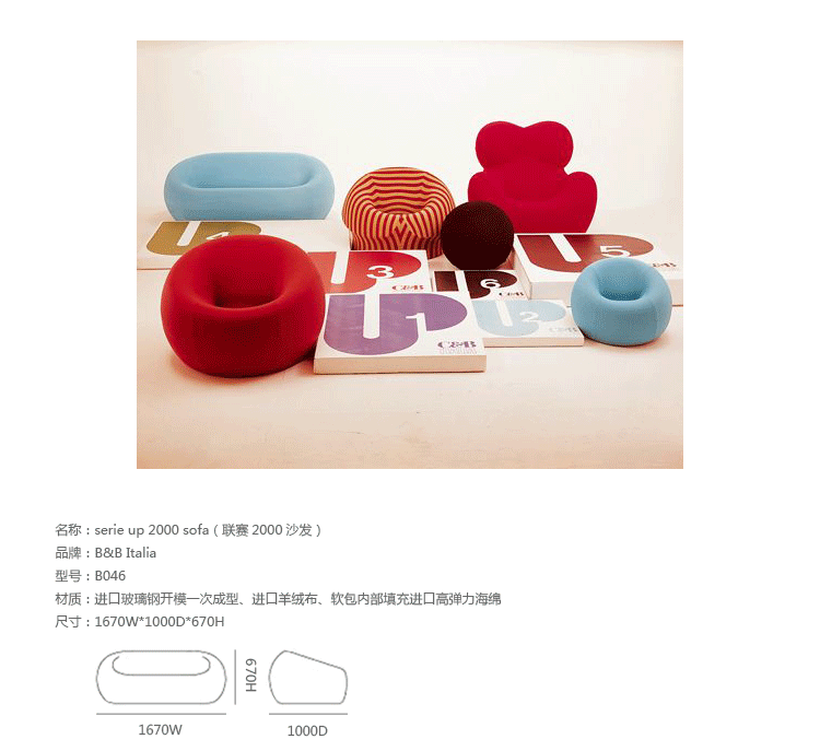 自从Up系列1969年面世以来,就成为一款最杰出的设计。此系列七款大小不一的坐具给人们以非凡的视觉冲击,让它们显得与众不同。Up5是此系列中最著名的一款,一个像女人的坐具与一个球形的脚凳连在一起,似乎要让女人屈服。其由意大利著名设计师Gaetano pesce设计,外形模仿女性性感的曲线轮廓,而且为了让使用者坐在上面能感受到超级舒服的感觉,特意将性感曲线的各个部位都加以放大。目前有UP5与UP6两种型号,适用不同体型的人。