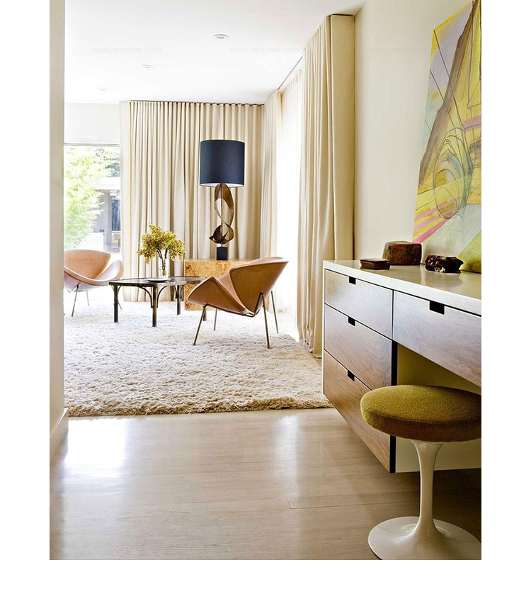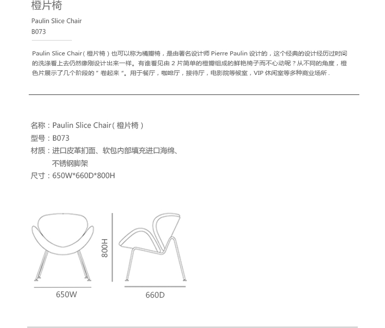 Paulin Slice Chair (橙片椅)也可以称为橘瓣椅,是由著名设计师Pierre Paulin设计的,从桔瓣椅的设计就能看出Pierre Paulin是具有国际性视野和前瞻性的前卫设计师,桔瓣椅全手工制作,针线走得直、流畅、缝线美观、均匀且自然,线条优美。这个经典的设计经历过时间的洗涤看上去仍然象刚设计出来一样。有谁看见由2片简单的橙瓣组成的颜色鲜艳椅子而不心动呢?从不同的角度,橙色片展示了几个阶段的“卷起来”。事实上,椅子几乎从每个角度看都呈现出不一样的优雅。橙片椅布料可为PU,真皮,植绒,羊绒布等多种面料,脚架为电镀铁架,颜色可多选。可用于餐厅,咖啡厅,接待厅,电影院等候室,VIP休闲室等多种商业场所。