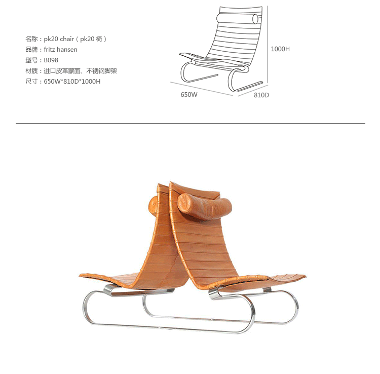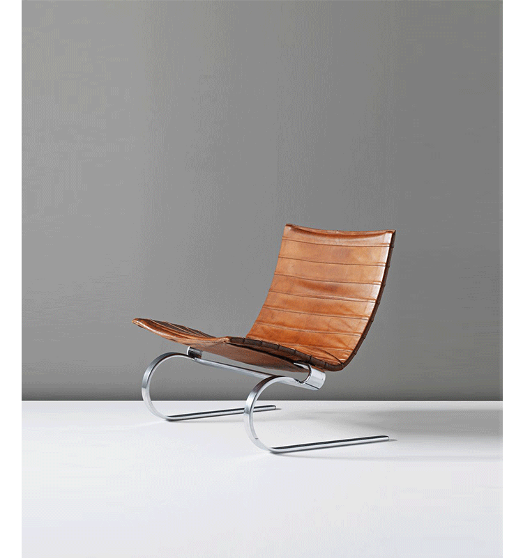 PK20 Chair(PK20 椅)设计于1967年,设计师是Poul Kjaerholm。最初设计此椅时,是想尽可能地利用生产其他皮革家具剩下的皮革条,以优化生产。但由于条形皮革的多样性,如今已抛弃了这个想法,只采用最优质的皮革条。低背版本的PK20已经列为伦敦维多利亚和阿尔伯特博物馆的永久收藏品。PK20 Chair(PK20 椅)主要由304不锈钢架和真皮构成,内部填充海绵。PK20休闲椅配有灵活的头枕,更具人性化,用作躺椅是优秀之选。椅子兼顾了休闲与优雅,外形独特,结构简单,是个性化的设计作品。