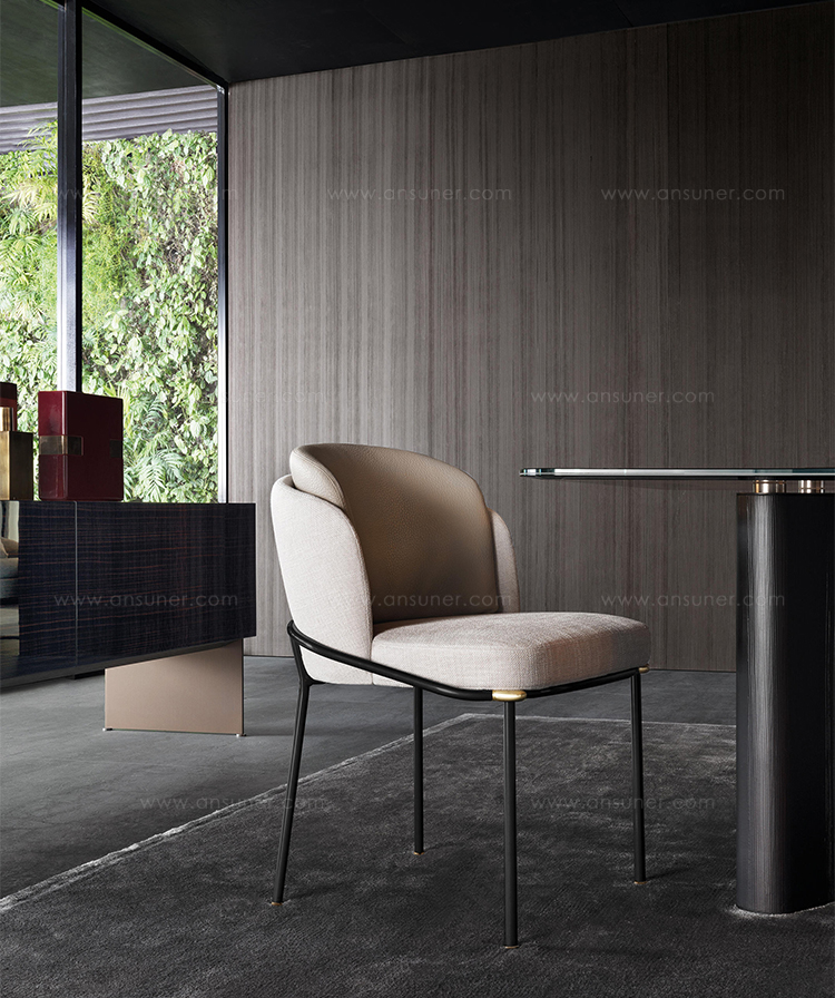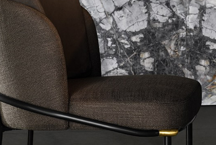 软垫座椅搭配优雅修长的椅腿,其材质为亚光黑色的金属管,亮光金色、黑镍金属色或浅铜色的细节使其倍显精致。