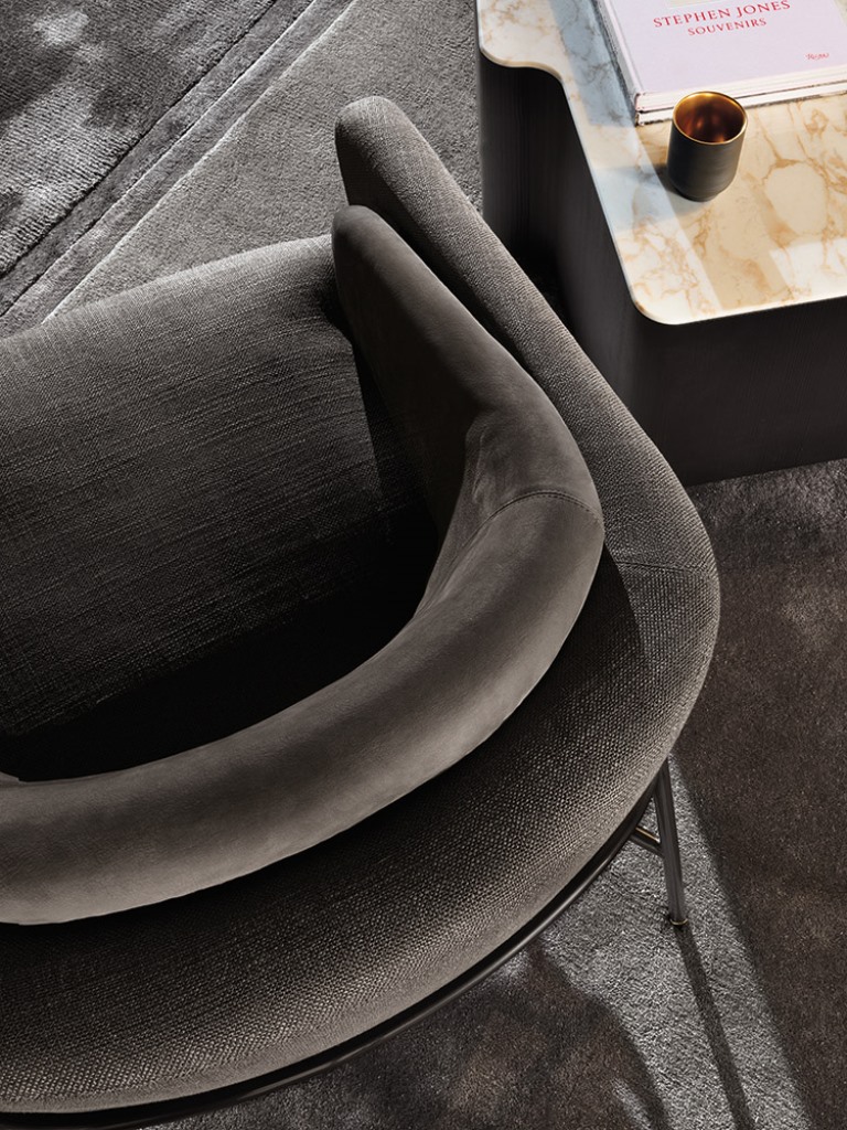 Fil Noir沙发系列的名称源于一个物品,那就是线条——连续性的象征。线条赋予沙发形状和具象:不仅创造出整体造型,还提供支撑并环抱其中。线条体现出简约的材料之选:亚光黑色漆面的金属管。沙发边角的亮光金色、黑镍金属色或浅铜色的圆环为这一严谨的材料之选平添一份柔和的装饰效果,与冷峻的结构形成巧妙的对比。