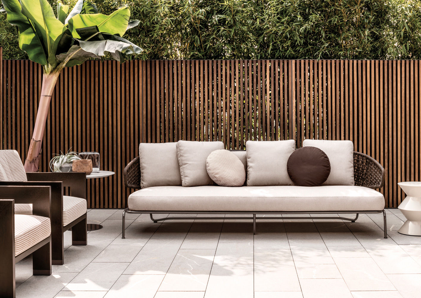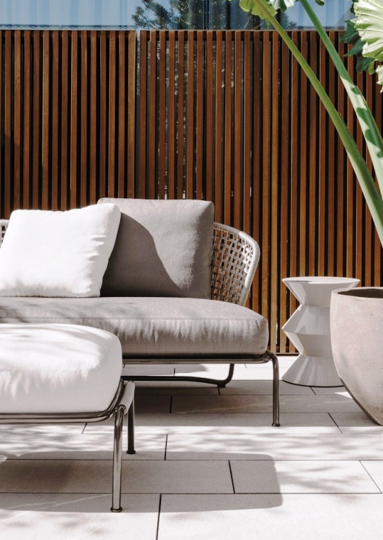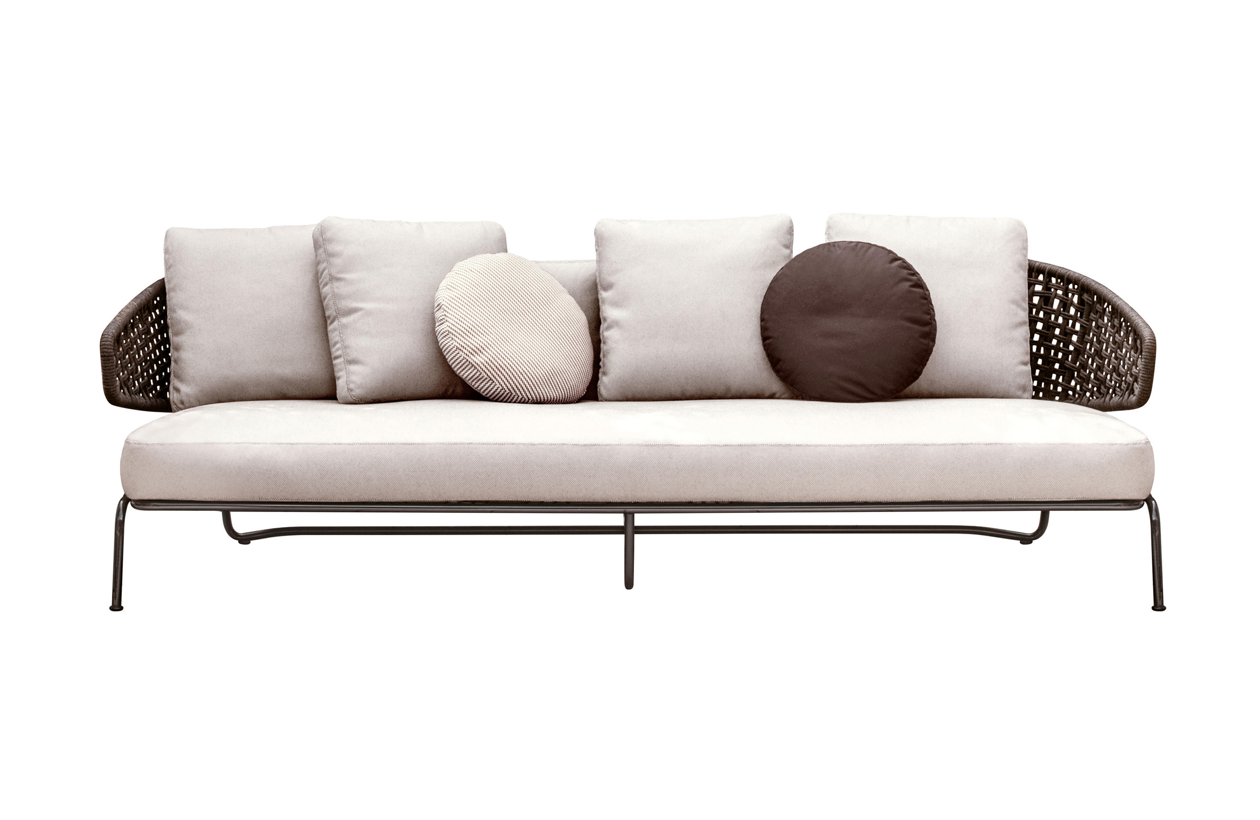 Aston是一个单品家族系列,其中包括沙发、沙发床、扶手椅、脚凳、座椅,为家居环境和“共享空间”提供优雅而时尚的装饰,在室内和室外皆可应对自如。阿斯顿“绳”户外系列采用金属材质的构架,搭配Pewter色聚酯漆面,部件都针对户外环境而经过特别处理,覆面采用疏水性纤维面料。靠背采用直径为7毫米的特殊聚丙烯纱线编织而成,两种颜色可供选择:浅灰色和深棕色,与全新Art Lifescape 02系列的面料和Alison “Dark Brown”户外系列的色调相得益彰。针对户外环境的特点,金属构架经过特别处理,搭配Pewter色聚酯漆面,覆面采用特殊聚丙烯纱线编织而成,有两种颜色可供选择:浅灰色和深棕色。坐垫采用Minotti Studio独家设计并通过激光加工而成的几何装饰。靠垫的内部填充物是高弹性聚氨酯泡沫,覆面采用疏水性纤维面料。