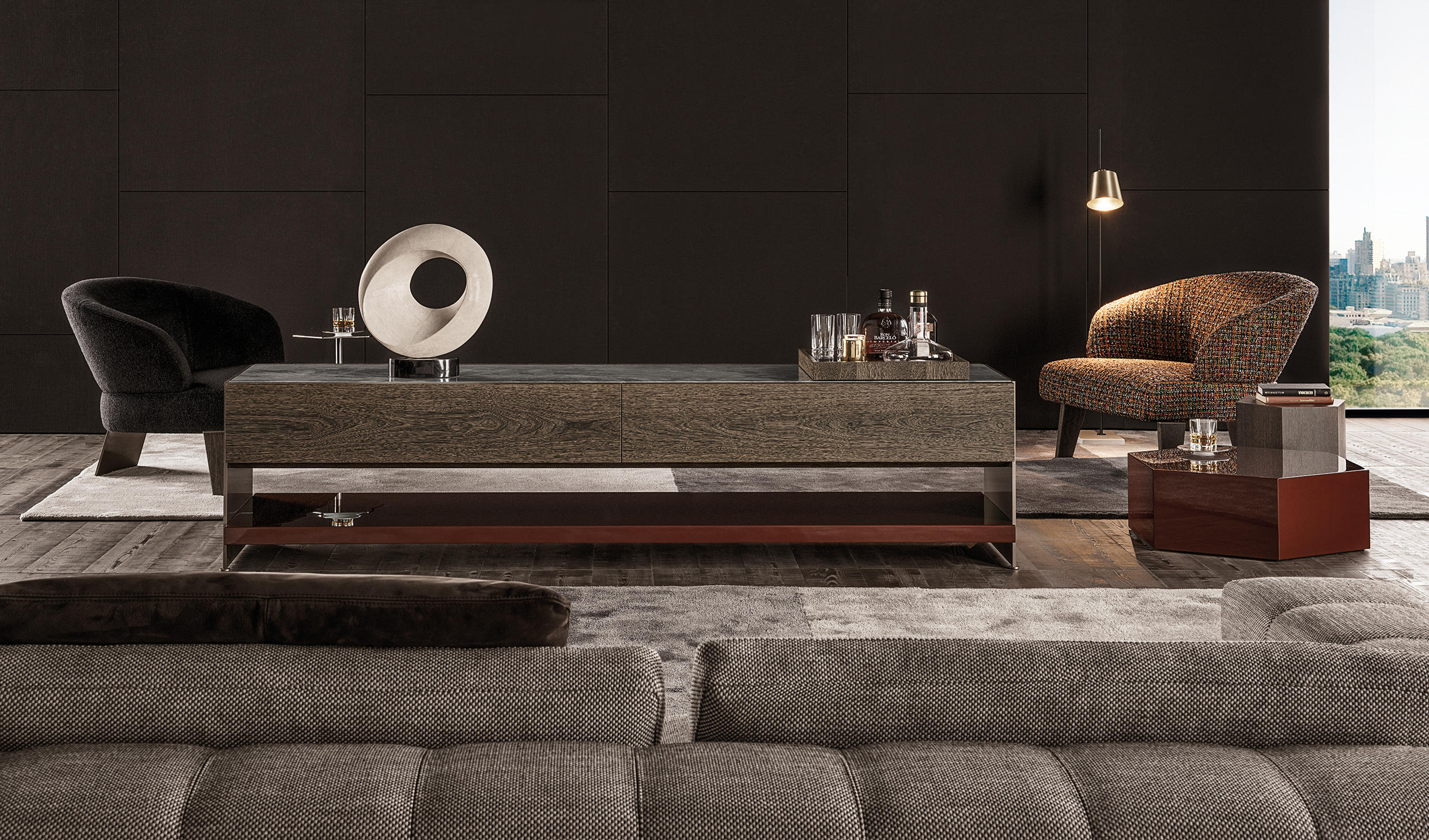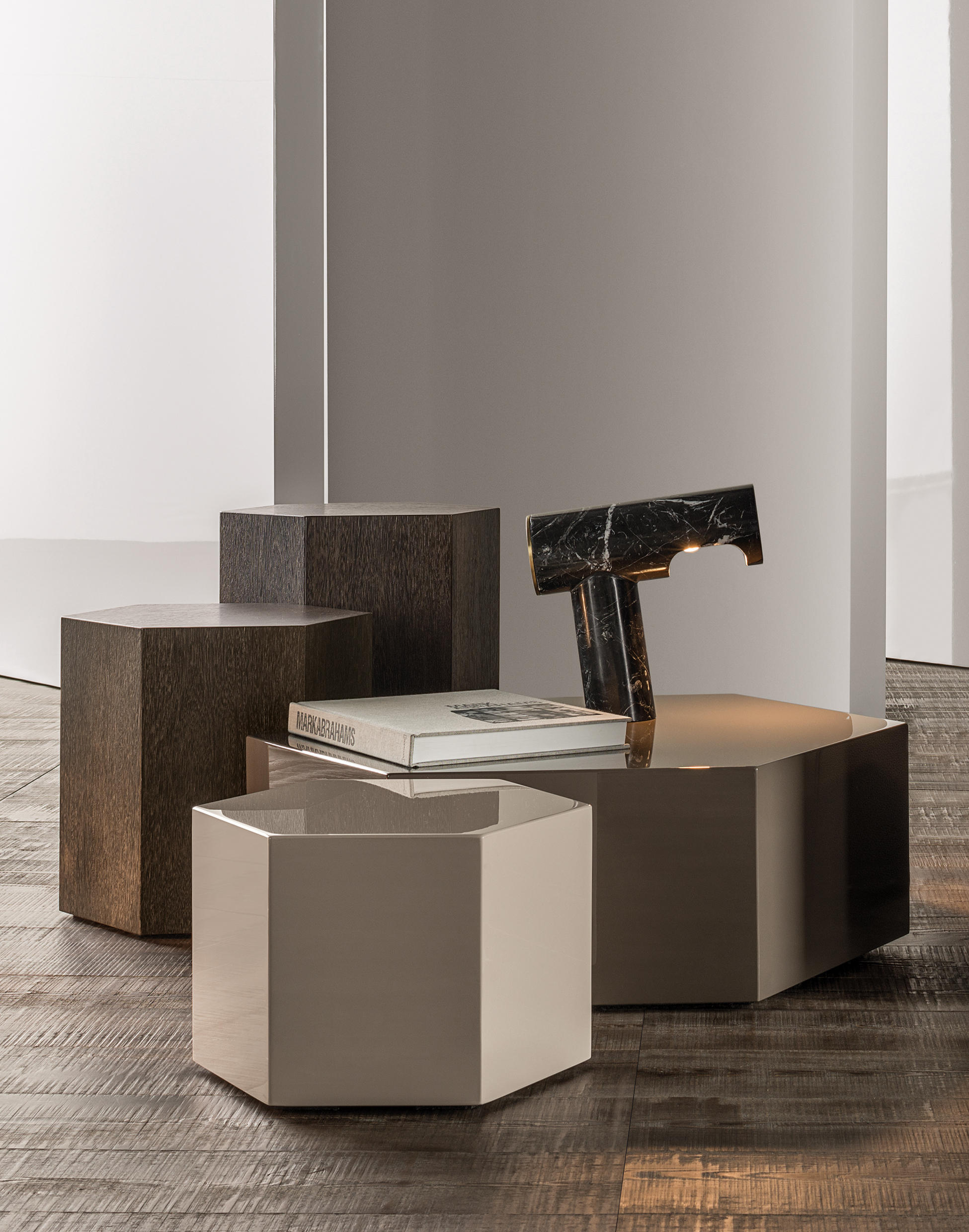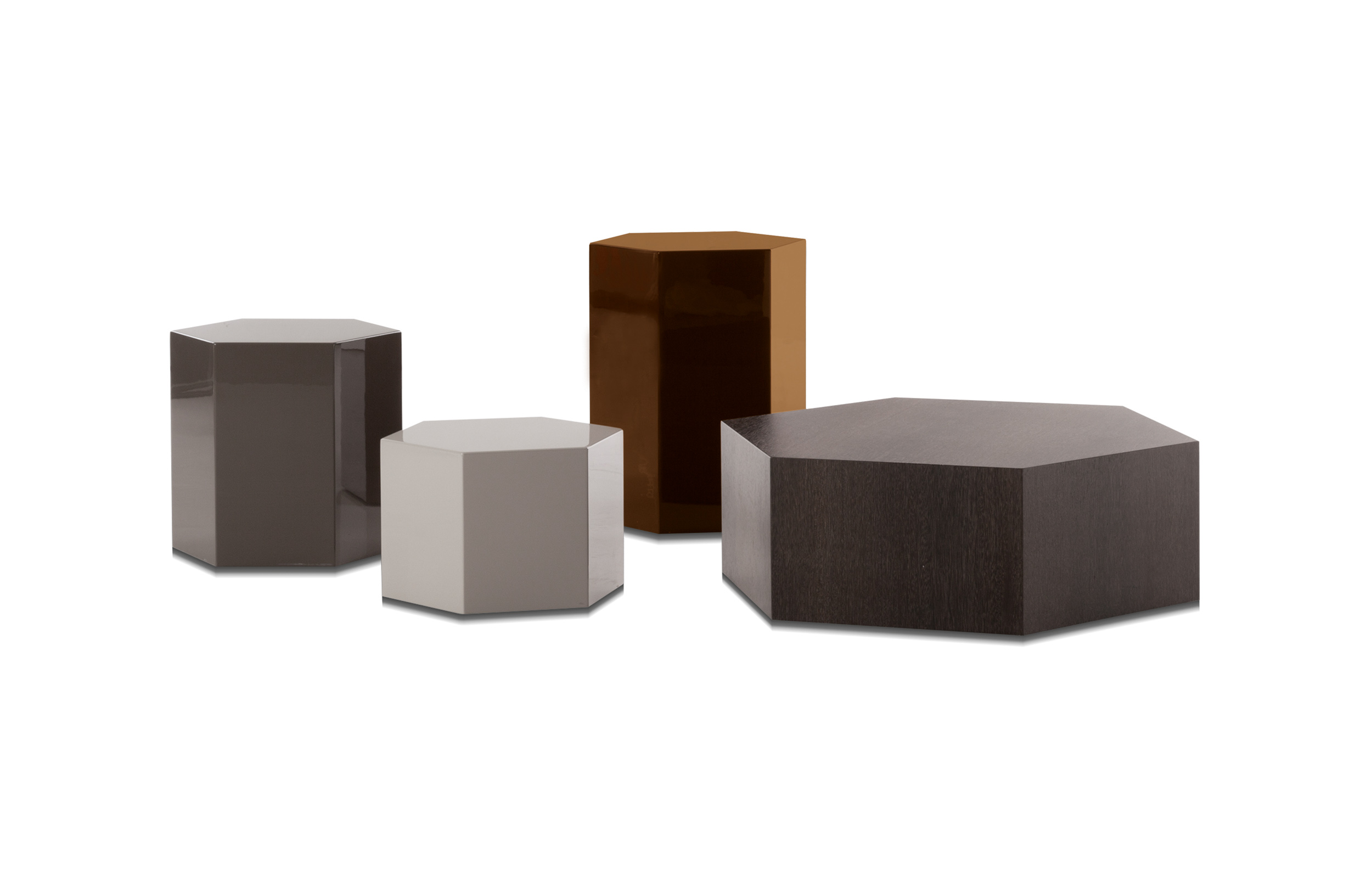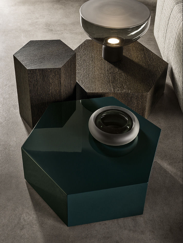 六边形棱柱的多面反光特质让人心动不已,完美呈现四款精致漆面的光泽:Corten色、青墨色、Sand色和灰褐色。在木制版本中,Aeron通过天然名贵的米灰色鲍迪豆木饰贴面来展现出其迷人的材质魅力。Aeron边几有多种尺寸可供选择,不仅造型极具创意,还可以与系列中的其他产品组合搭配出饶有趣味的效果。