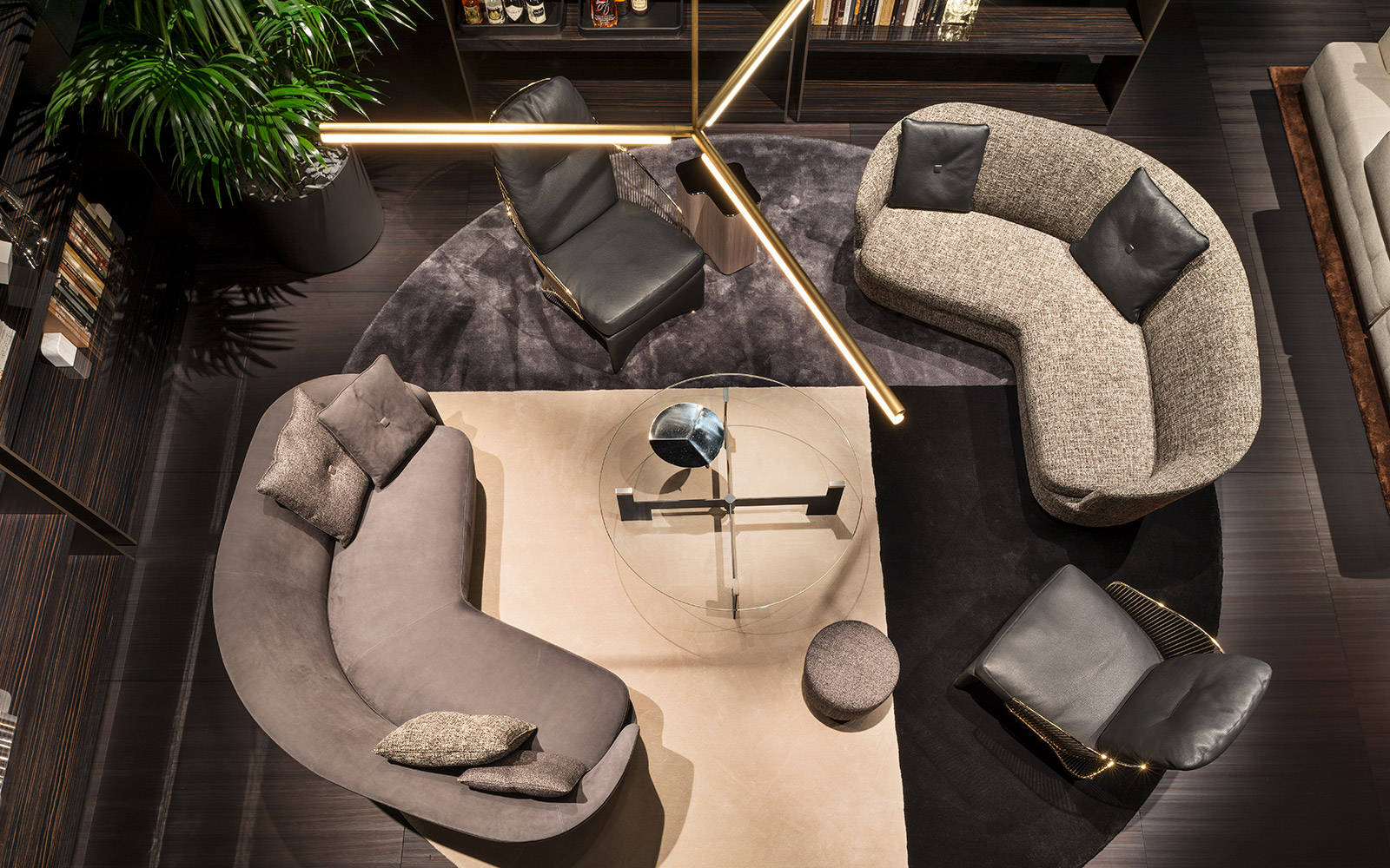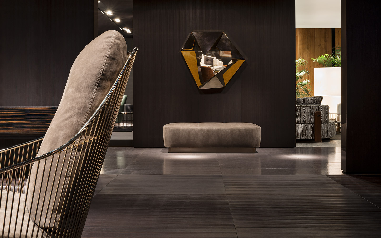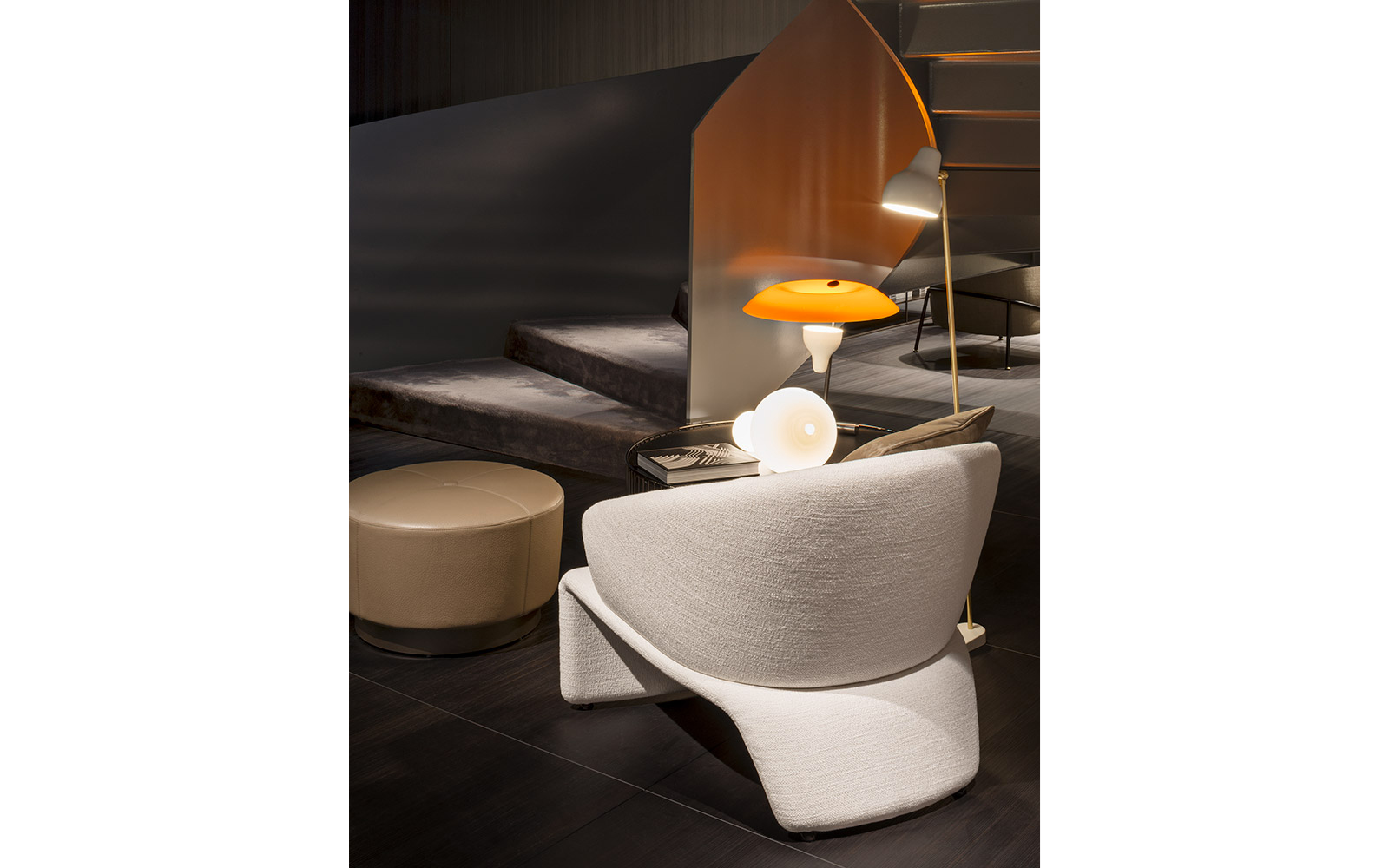 柔和的造型、紧凑的比例和具有视觉冲击力的细节呈现出精致的美学语言,金属基座采用淡铜色的表面设计。
