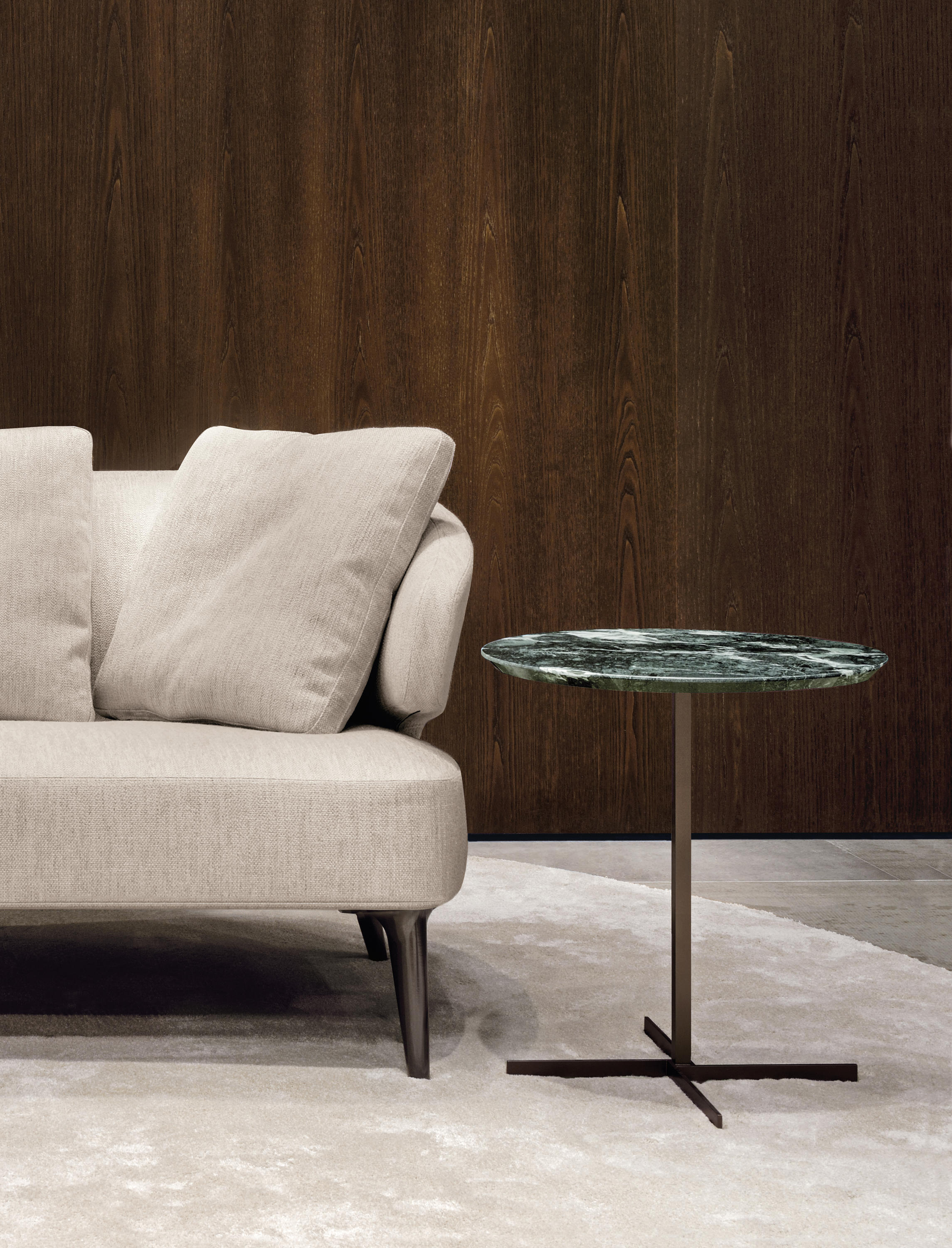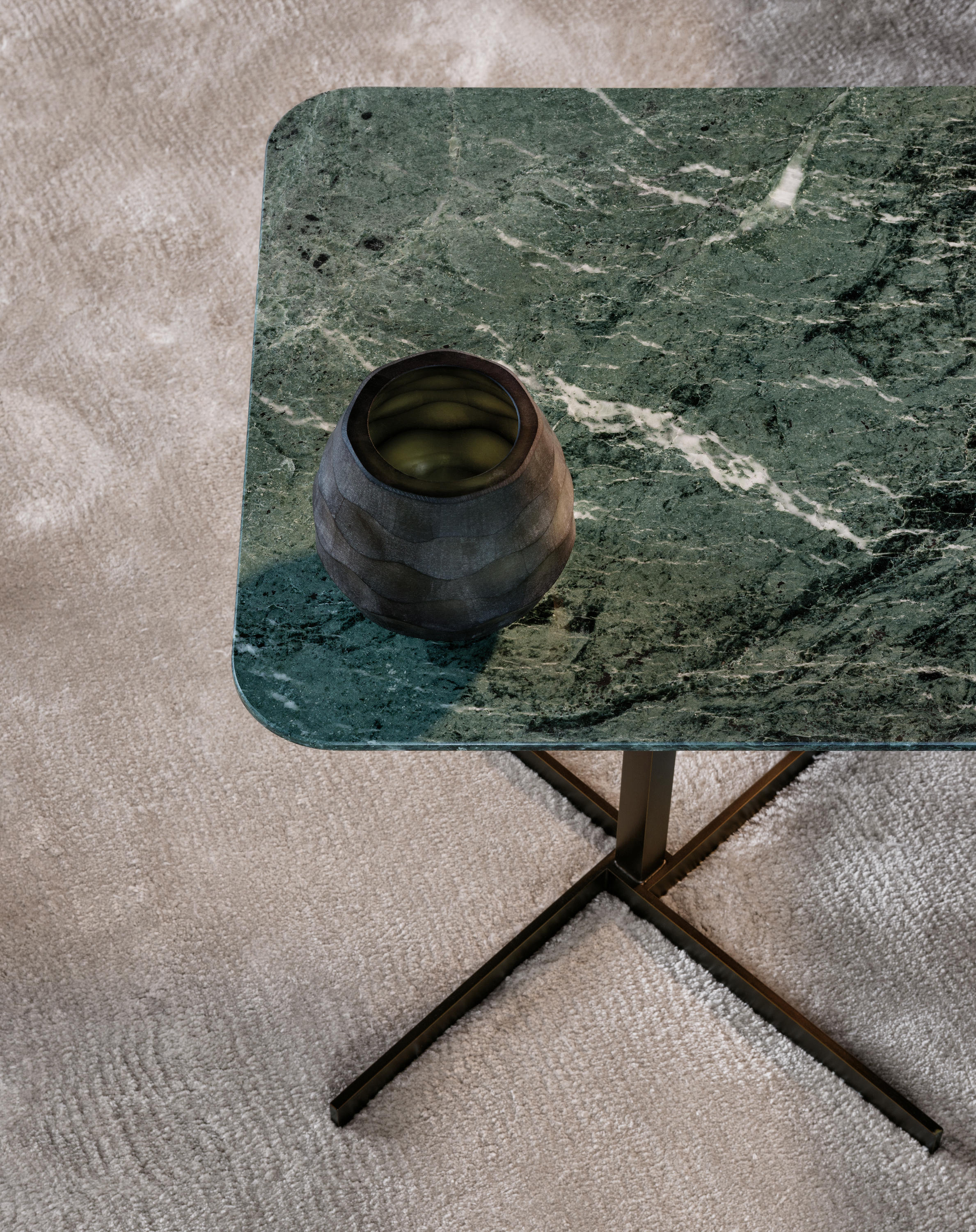 这一系列的产品用简洁的造型来搭配珍贵的材质,比如带有绿色调的Issogne大理石,台面采用斜切边缘的设计。地面支撑为金属材质,漆面为铜色,采用十字造型。Joy是一款可以搭配新系列中所有沙发座椅的边几,就造型而言,有高度为55厘米的圆形和高度为41厘米的正方形可供选择。