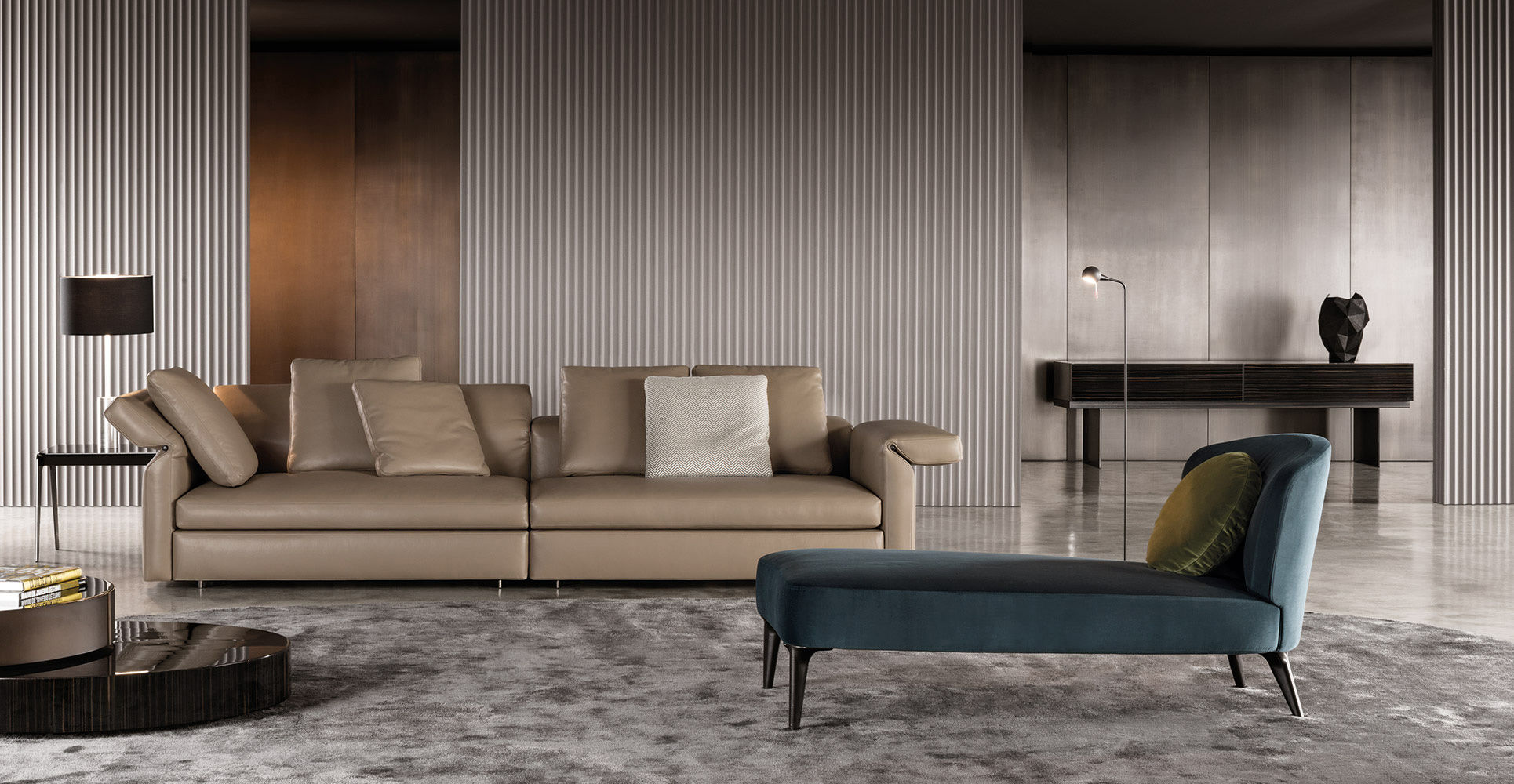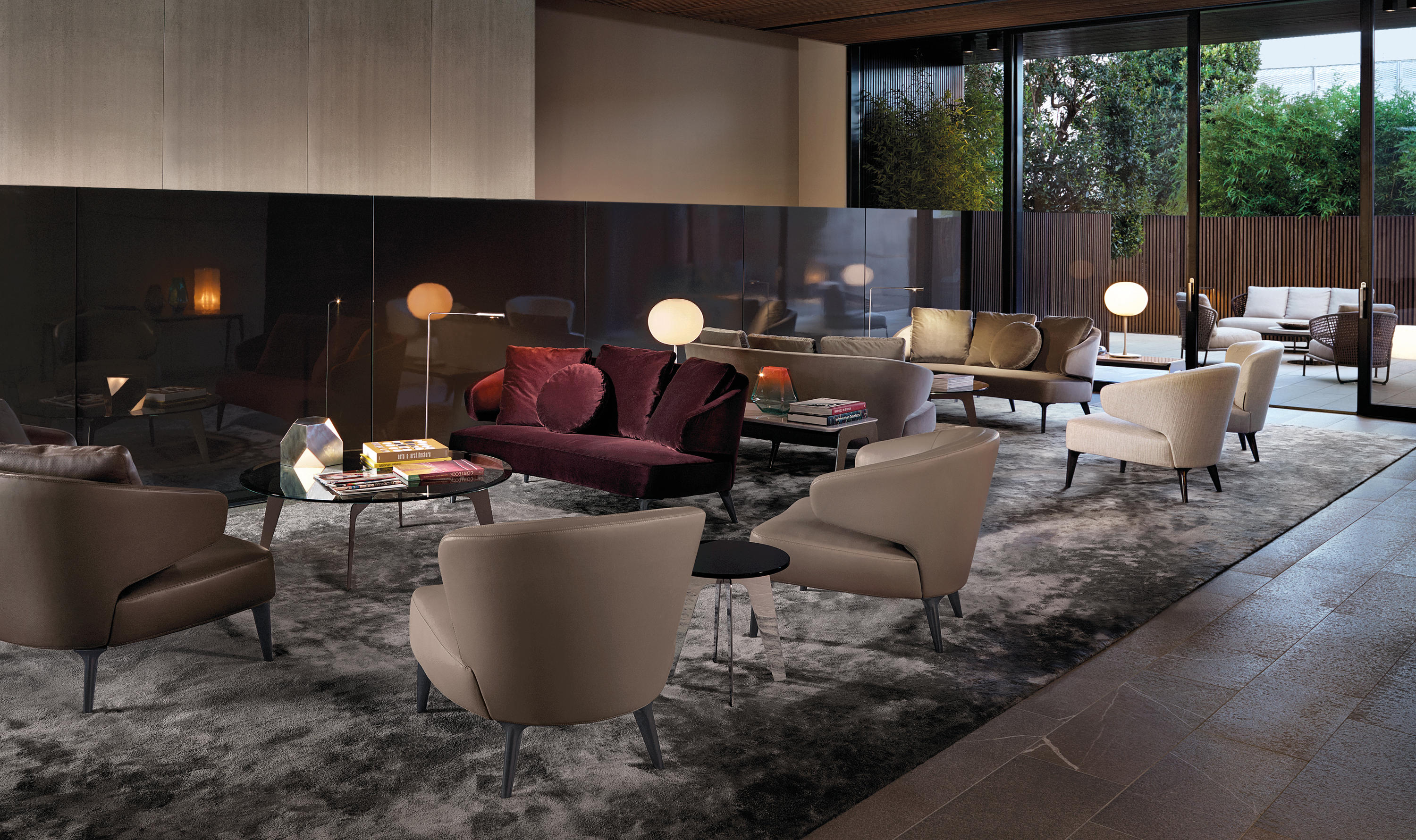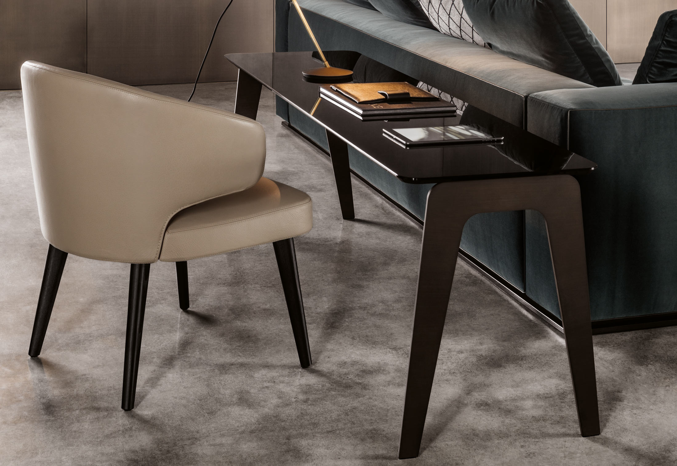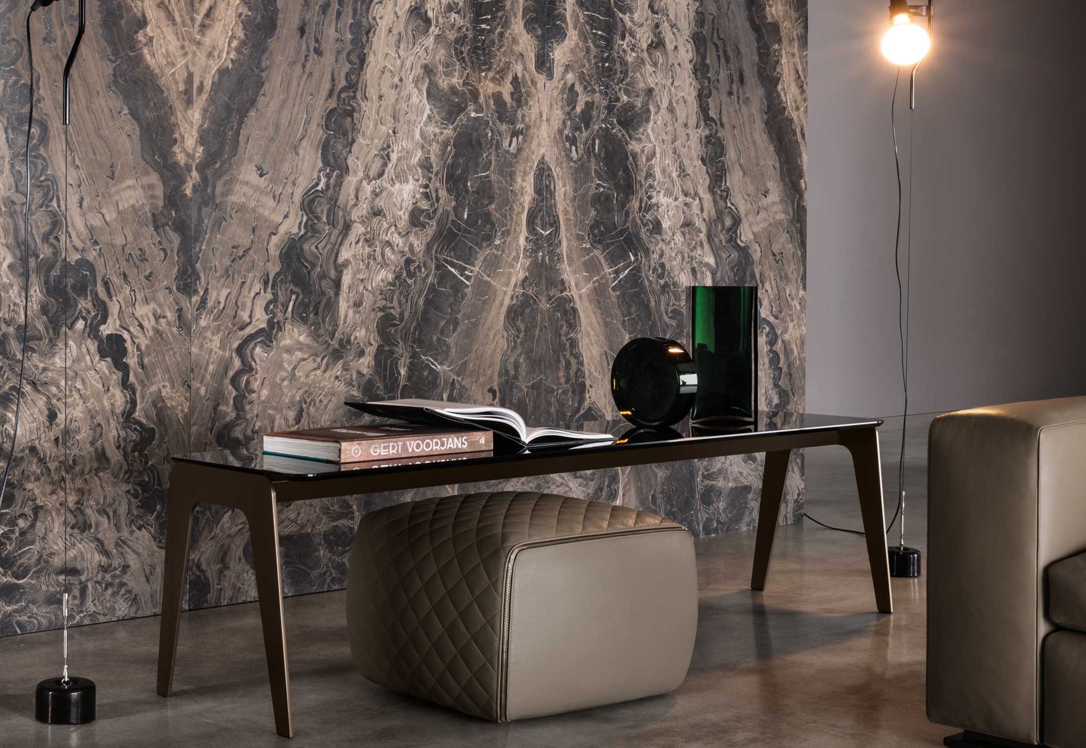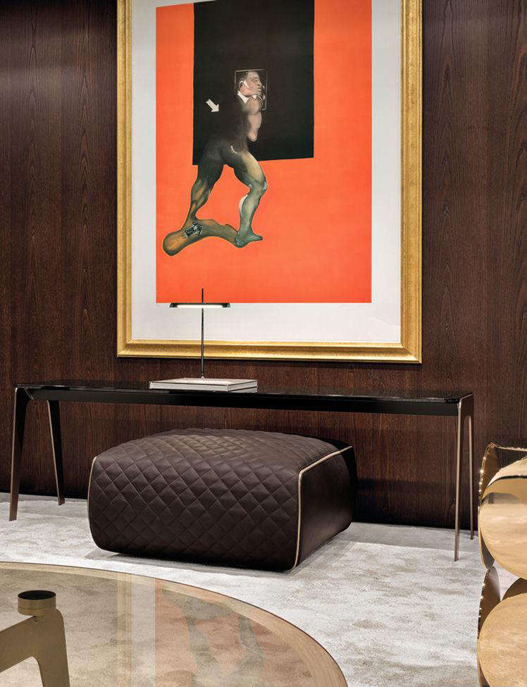 以精美梣木底座致敬传统黑檀木艺术,搭配拥有圆滑转角与柔和饰边的光泽漆面黑檀木、黑色脱蜡琉璃及 Marron Damasco 大理石台板。