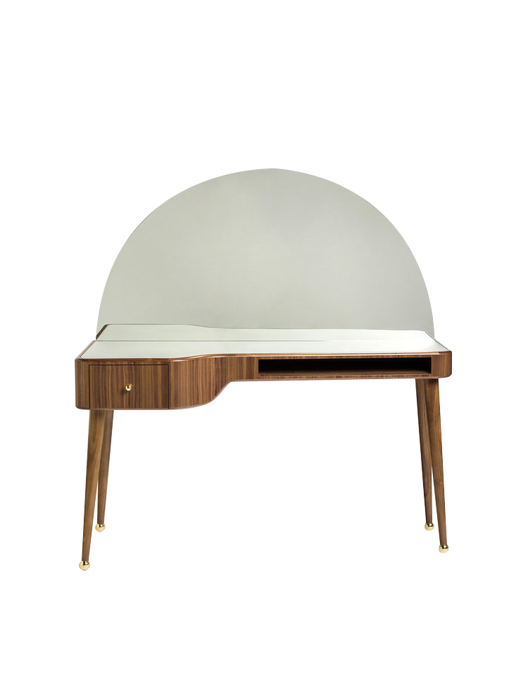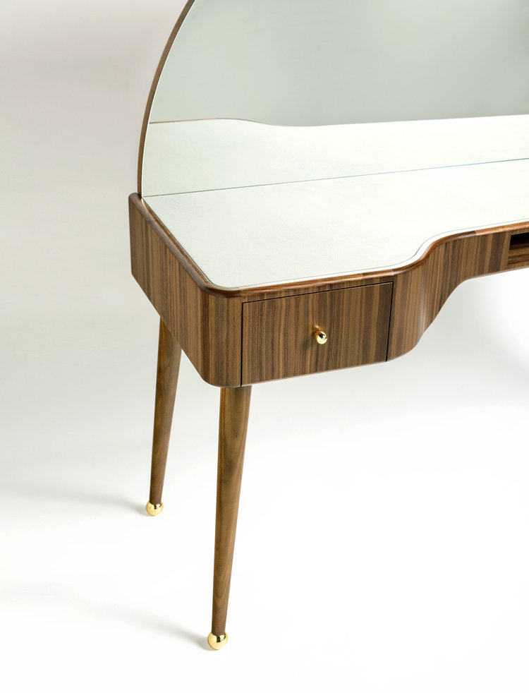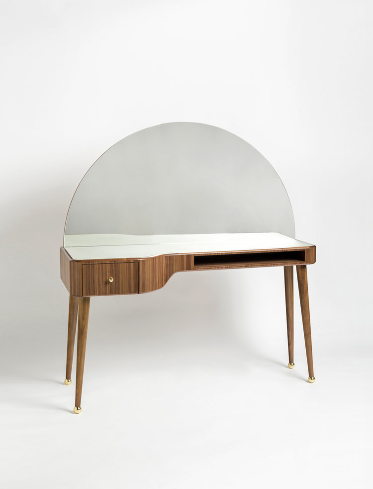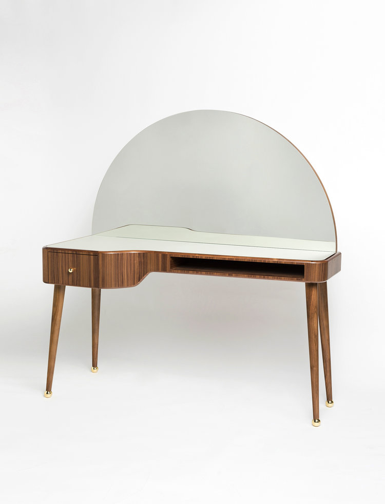 “La Nouvelle Vanite”是由Merve Kahraman设计工作室设计的由美国胡桃木贴面制成的化妆桌,背面是一个弧形的镜子。