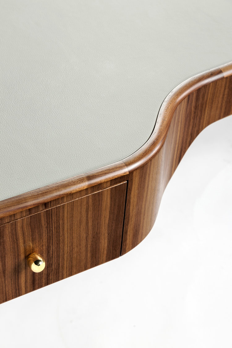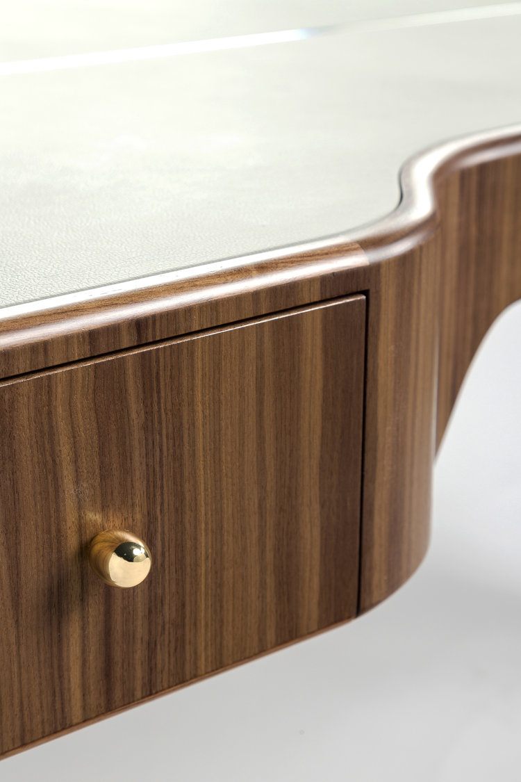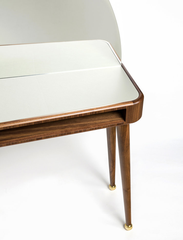 这张工作/化妆台左边有一个抽屉,右边有一个小壁龛,用来存放你的物品。表面皮革和黄铜是可定制的。