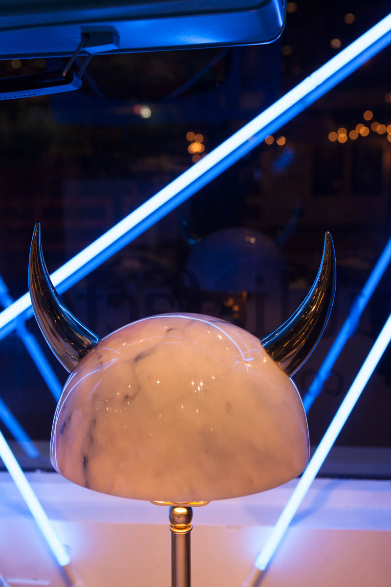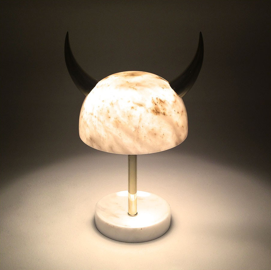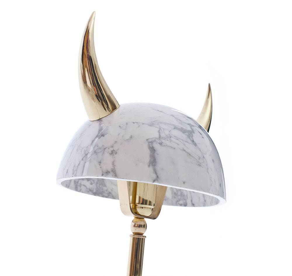 “Min Lilla Viking”(My Little Viking)台灯向老式斯堪的纳维亚战士头盔致敬。 它与现代风格的形状和风格相呼应。 金属盔甲和骨头已被大理石和抛光黄铜所取代,使这种野蛮的象征更加优雅。 当点燃时,Carrara和Afyon大理石通过揭示类似行星的石头的丰富自然纹理使观众感到惊讶。 “Min Lilla Viking”是将在不久的将来发布的一款严肃的漫画台灯中的第一款。