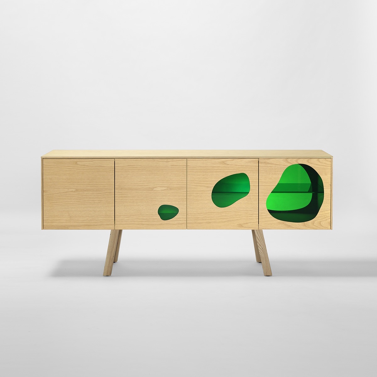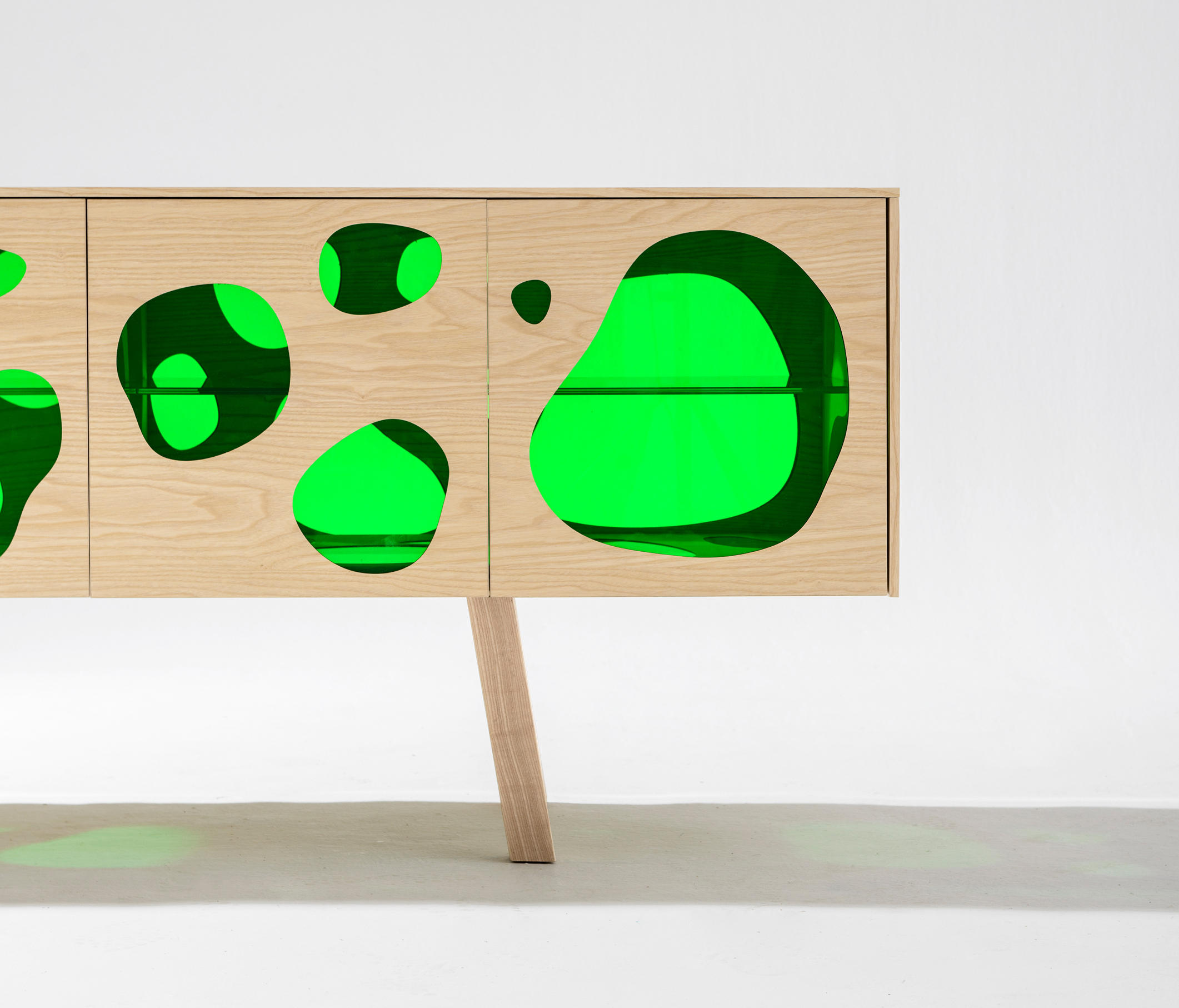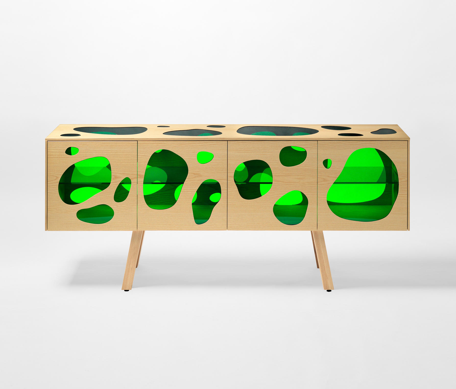 Aquário-带有门的木制餐边柜。 坎帕纳兄弟(Campana Brothers)设计的新橱柜Aquário。“我们与BD Barcelona Design的艺术总监Ramónúbeda保持联系已经有几年了。我们讨论了已经成熟并成为我们制作的自助餐的创意。费尔南多·坎帕纳(Fernando Campana)解释说:“灵感来自水族馆的想法,以创造出这件作品。” 温暖和寒冷。它已经成为我们设计语言的一部分。我也想玩对重的想法。玻璃的轻便和木头的体积。第一个的非物质性和第二个的物理性。” Fernando补充说:“餐边柜由木材,白蜡木或松木以及彩色玻璃门制成。