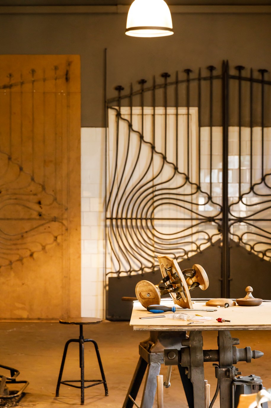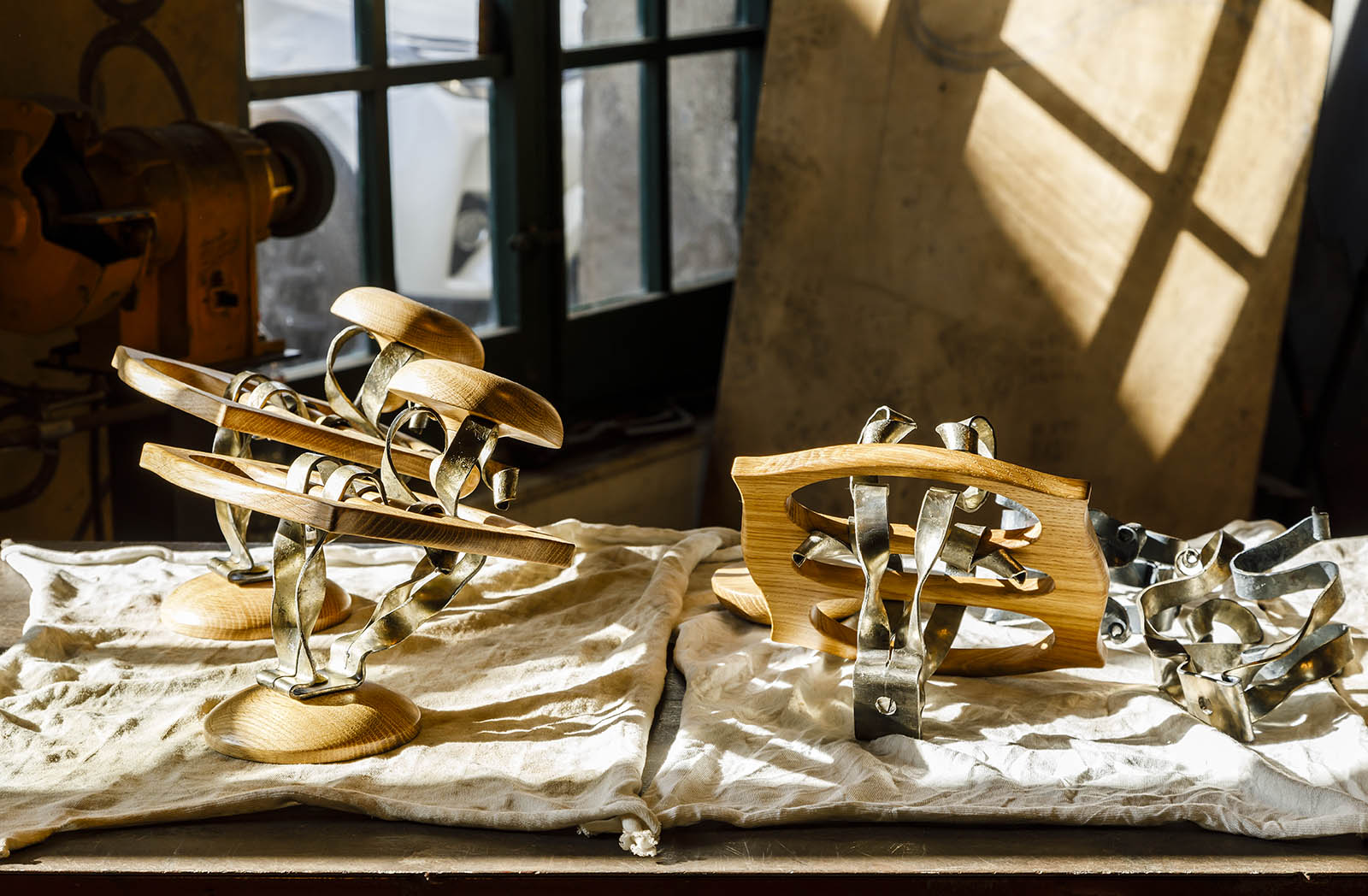 具有弯曲边缘的中央矩形木制主体。由三个细长开口交叉的表面,在中间与两个镀黄铜的钢带连接在一起,另外两个也是木质的。用圆形固定在一起,一个是周向支撑,另一个是正确的称呼,是衣架。其他配件也可以悬挂在中央部件的杆上,例如围巾和雨伞。